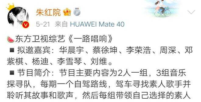 《一路唱响》的拟邀嘉宾阵容有华晨宇、蔡徐坤、李荣浩、周深、邓紫棋、杨迪、李雪琴、刘维。
