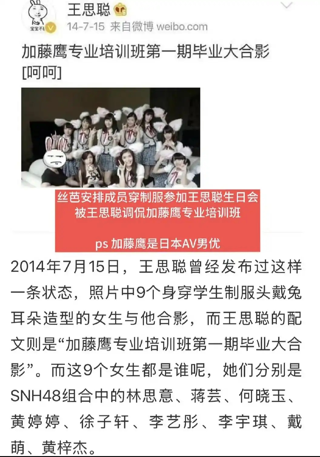 更让人震惊的是,2015年王思聪在三亚办生日派对时,竟然安排好几位丝芭女团的成员穿着短裙去陪酒助兴,这种不太光彩的事,居然还被网友抓拍到,还起了个名字叫“选妃现场”。