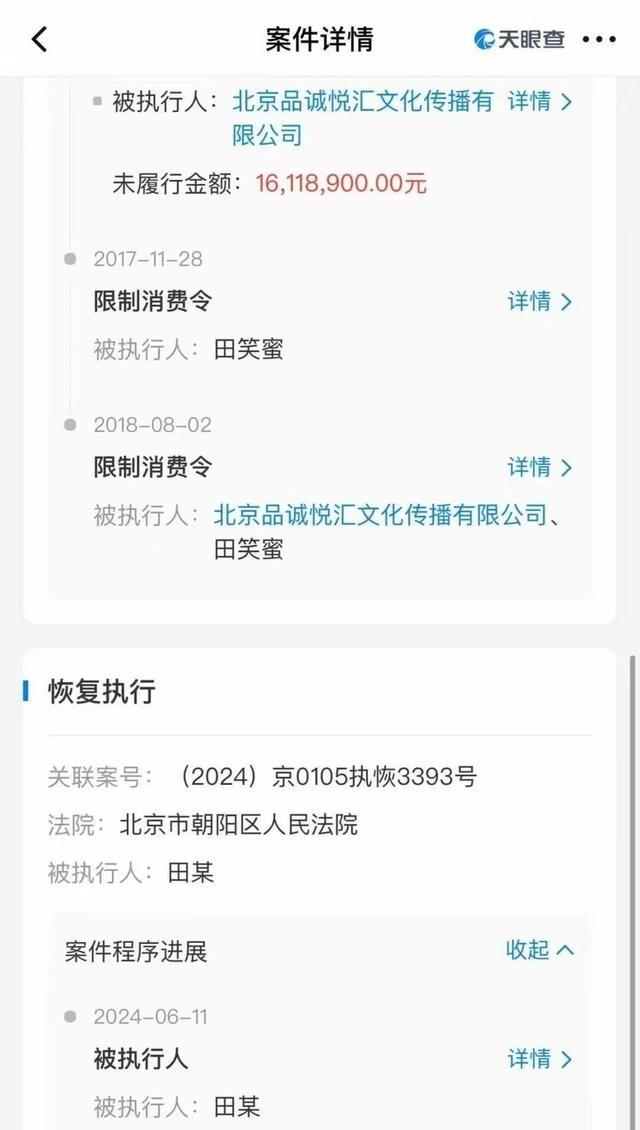 根据中国执行信息公开网的数据,田笑蜜至今仍有1611万余元的案件尚未执行。