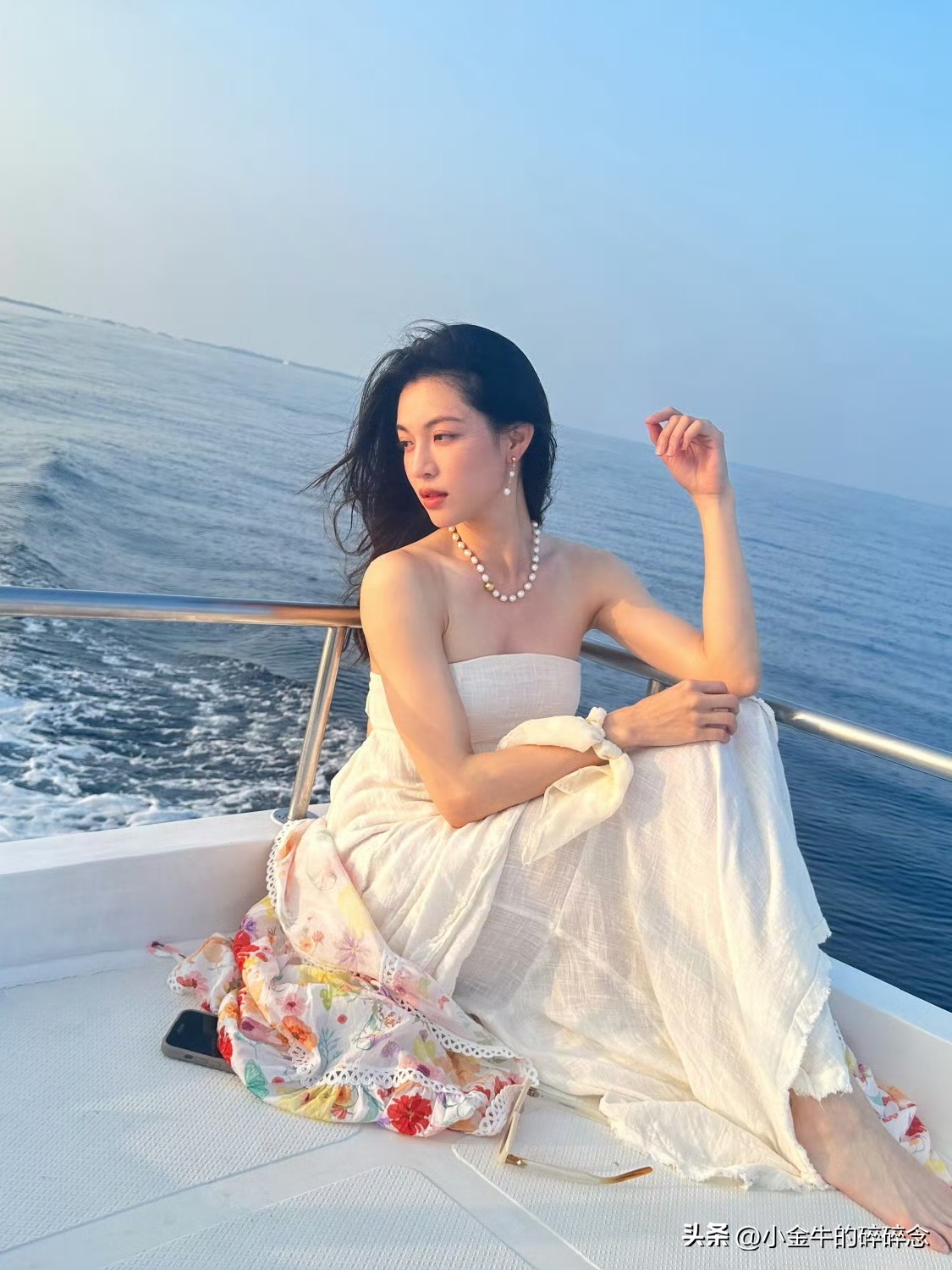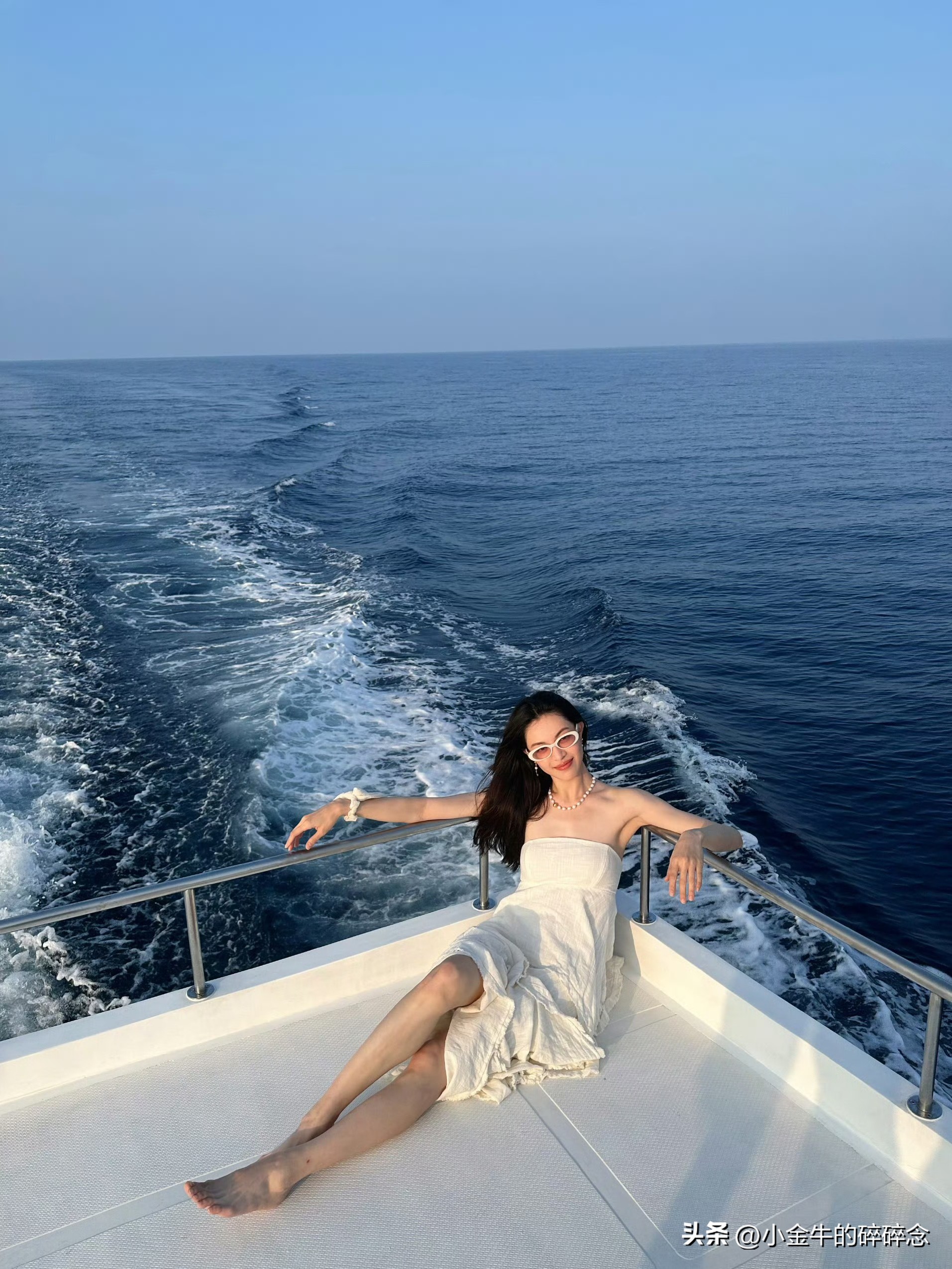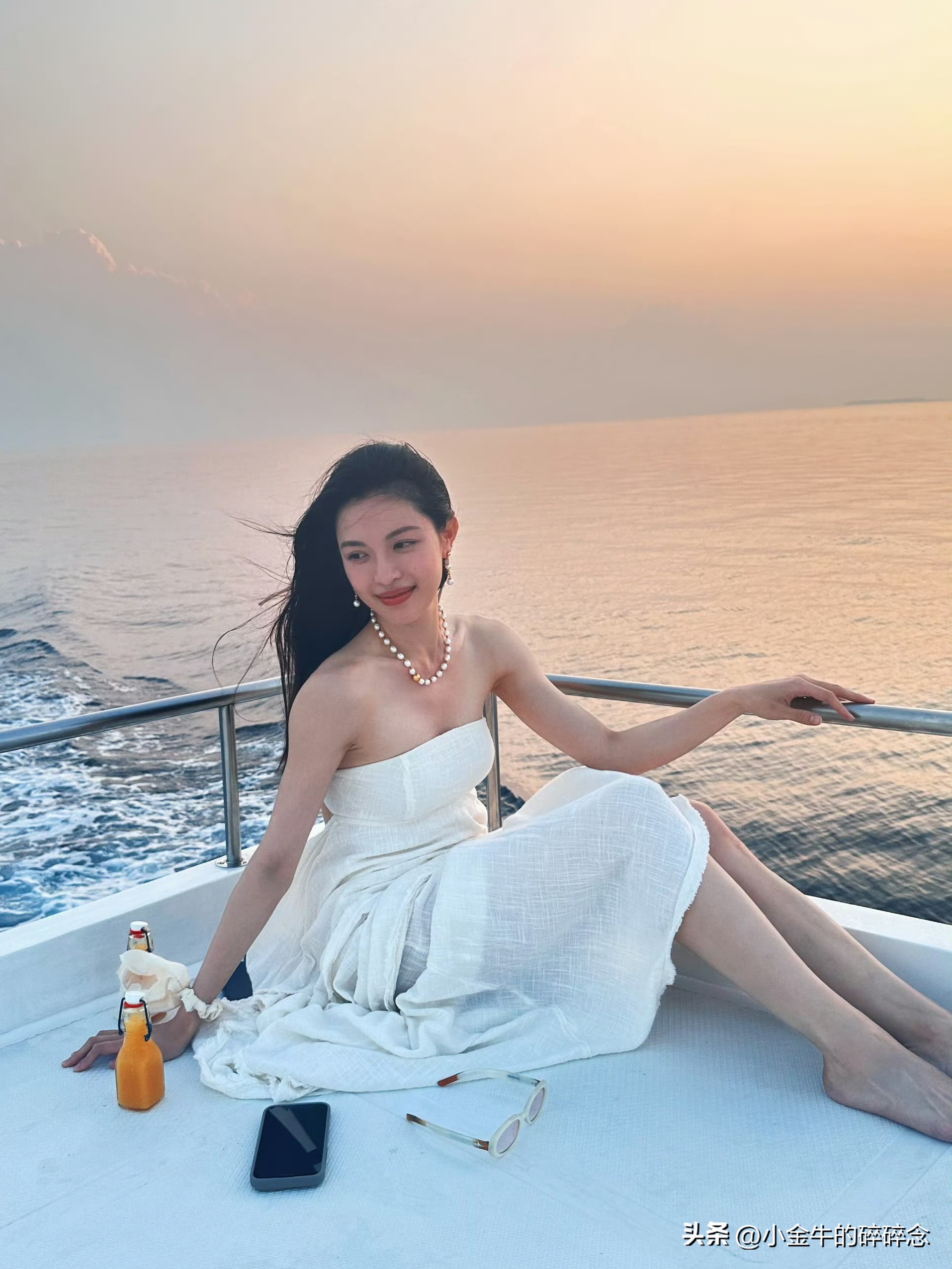 钟楚曦,晒出和闺蜜同游马尔代夫旅游照,白色抹胸裙看起来仙气飘飘,坐在船尾,秀发随风飘起的模样,真的太好看了。