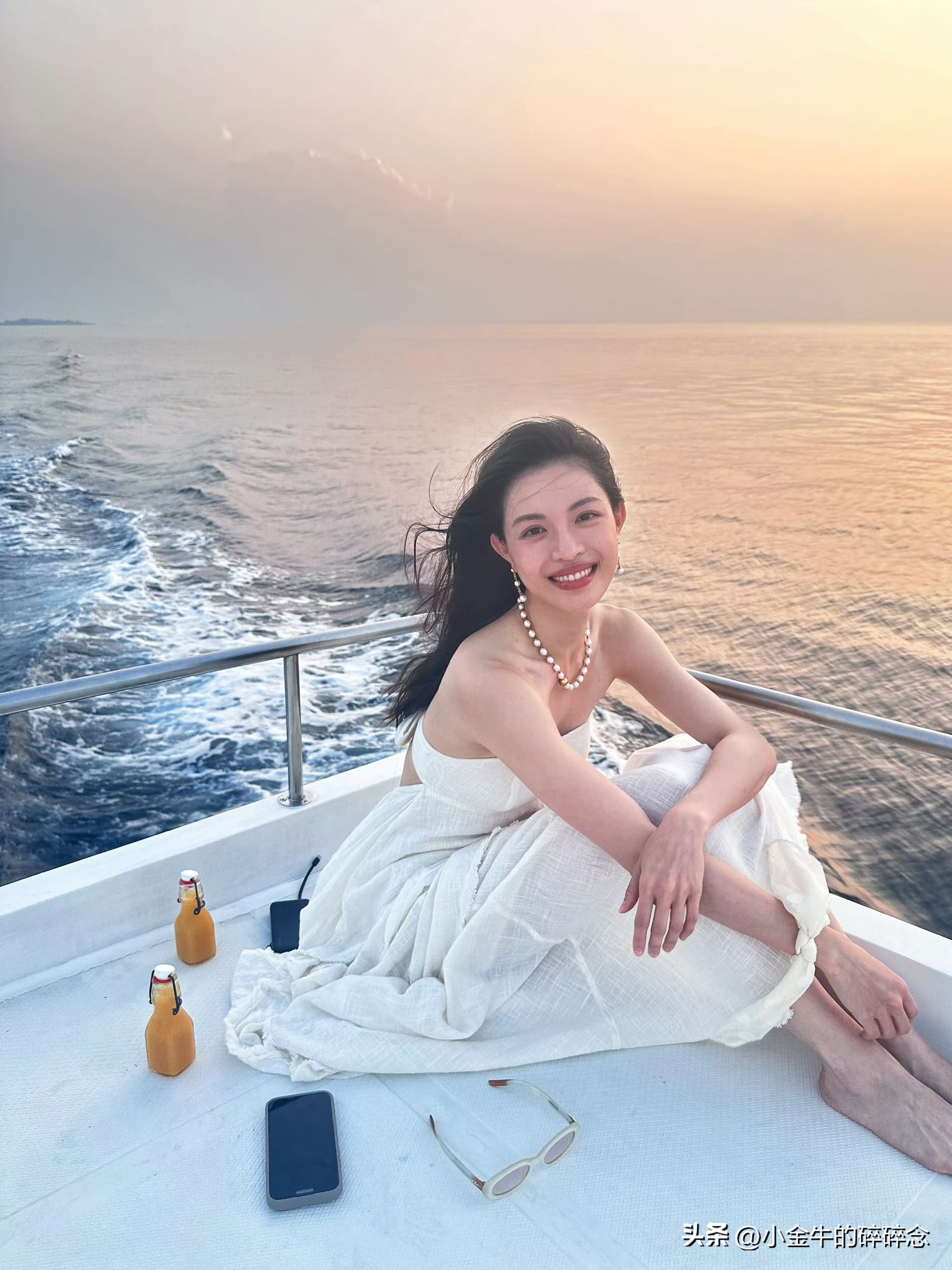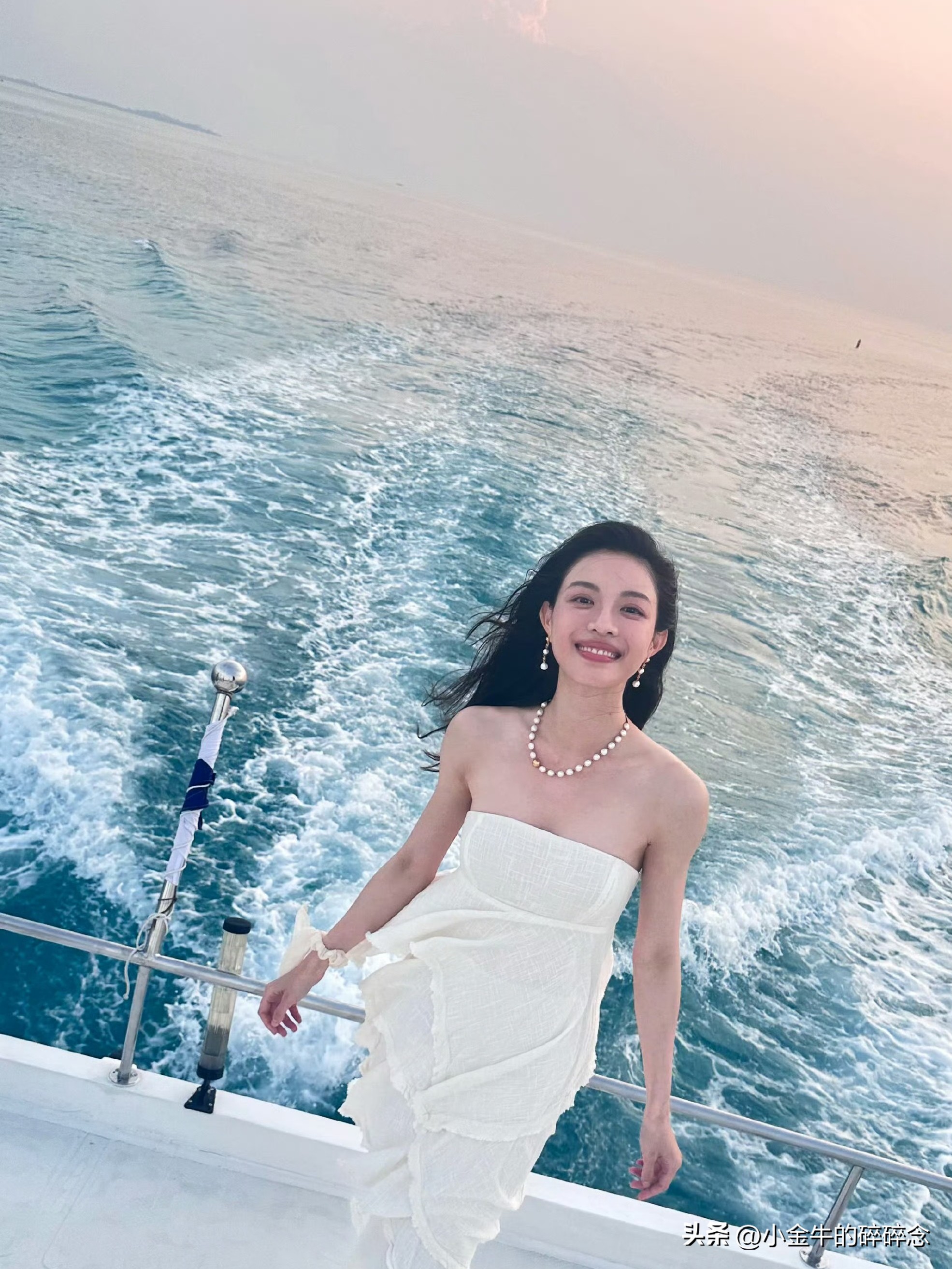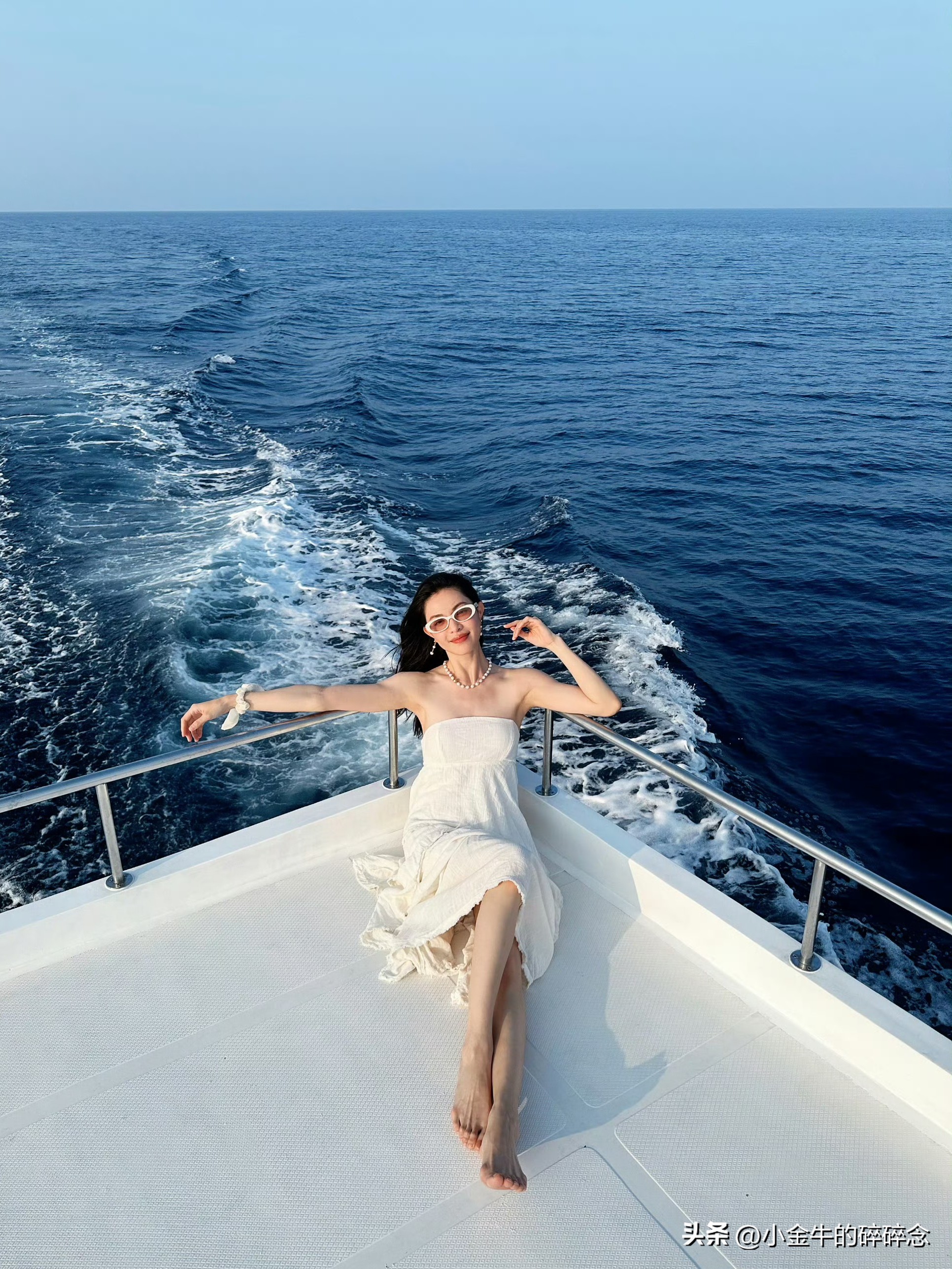 钟楚曦,晒出和闺蜜同游马尔代夫旅游照,白色抹胸裙看起来仙气飘飘,坐在船尾,秀发随风飘起的模样,真的太好看了。