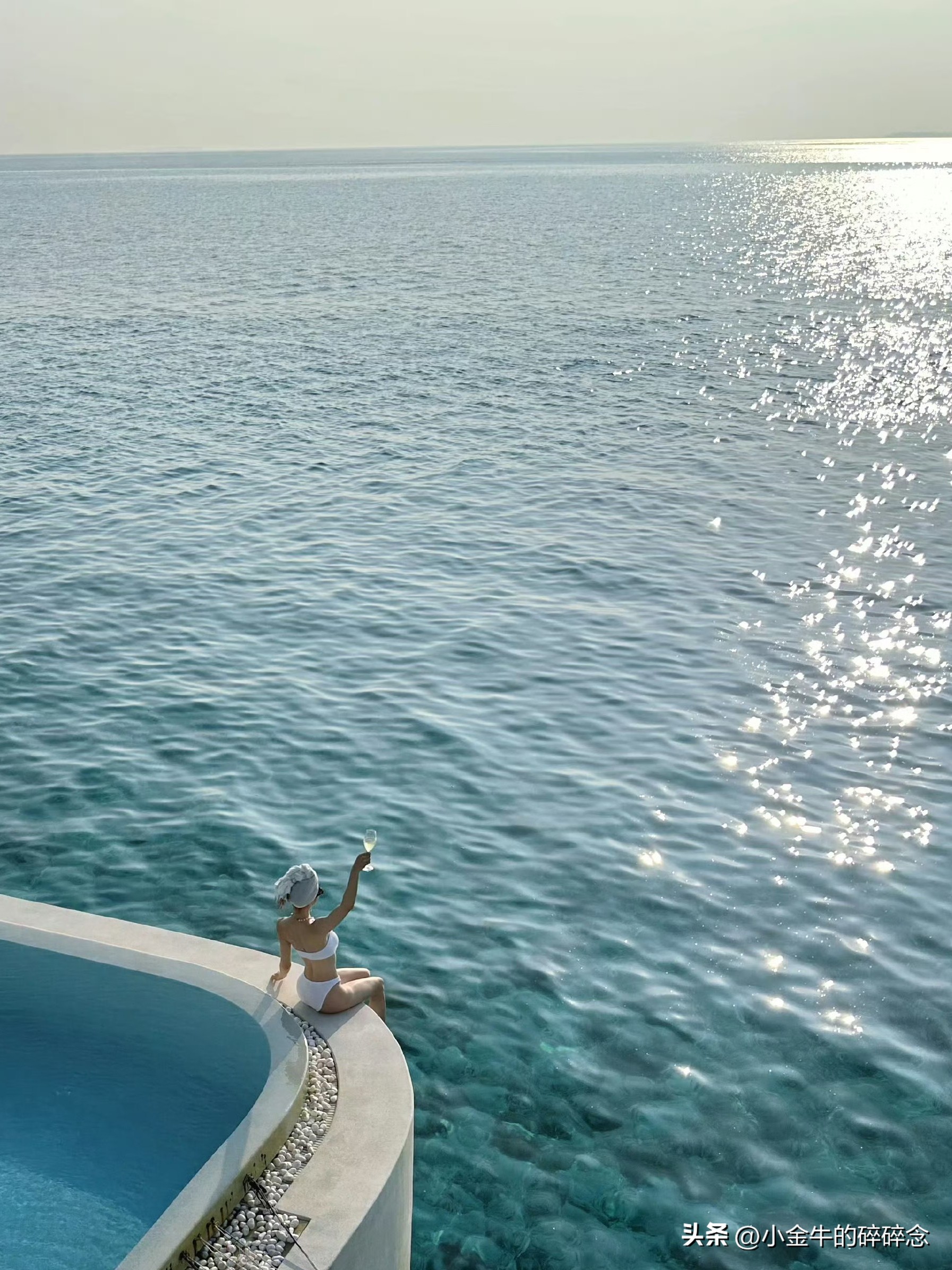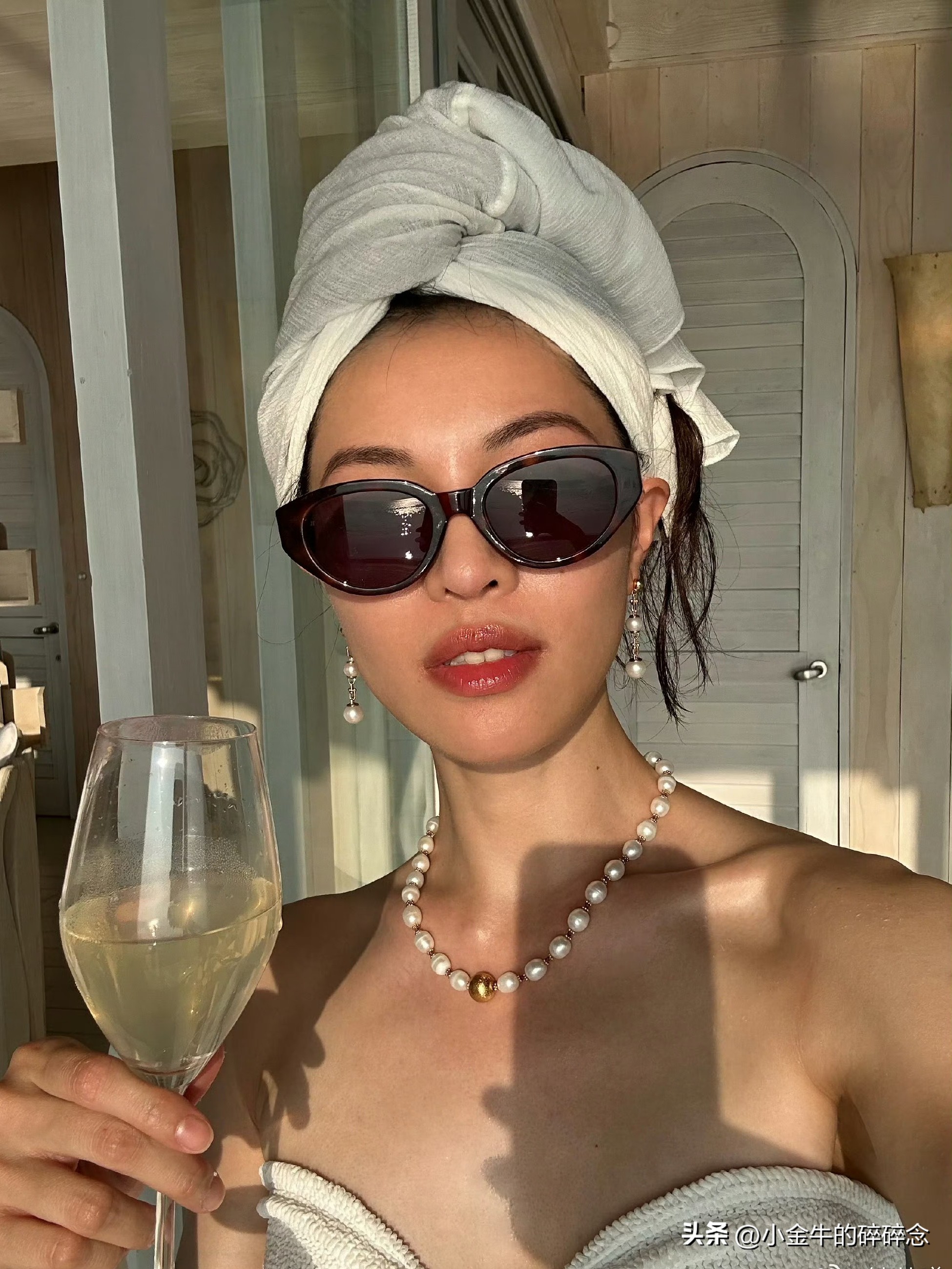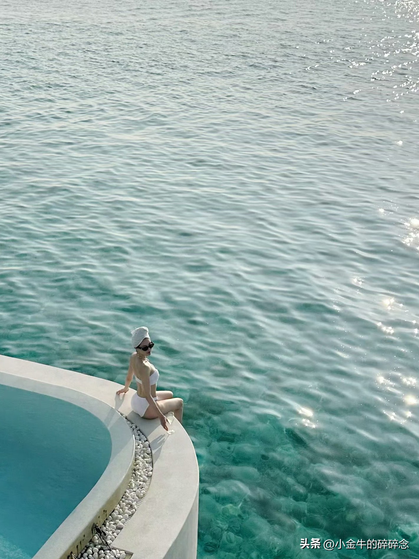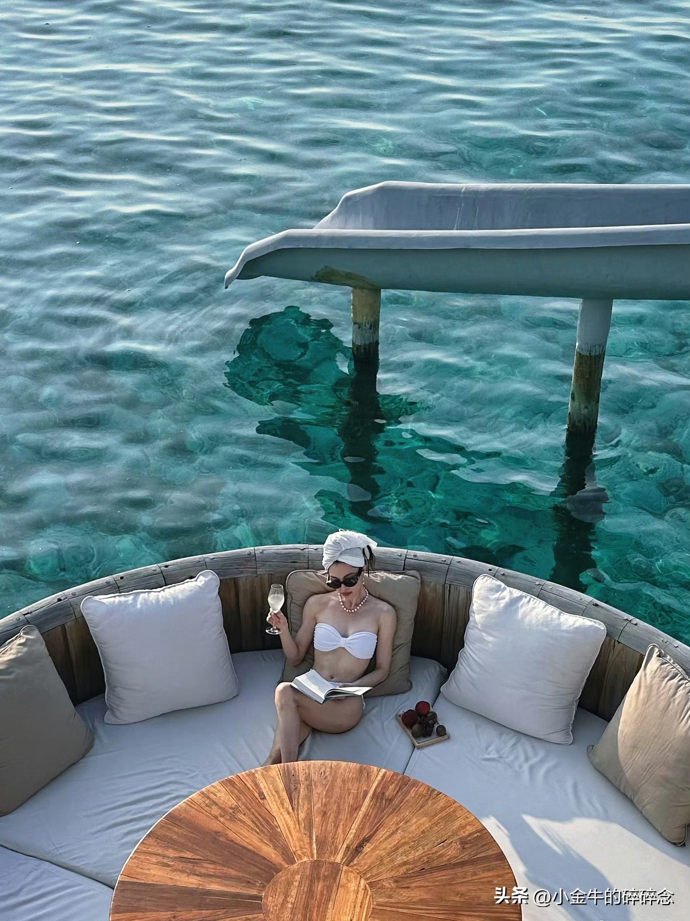 白色比基尼泳装,将好身材一览无余,随意裹个头巾,有点阿拉伯贵妇的感觉。