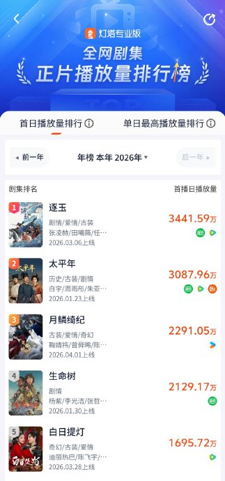 开播24小时内全网正片播放量达2747万,稳居年度独播剧首位;优酷站内热度次日破8000,创平台年度古装剧峰值;抖音剧集榜与角色榜同步登顶,鞠婧祎饰演的“露芜衣”以1.05亿角色热度断层领先。