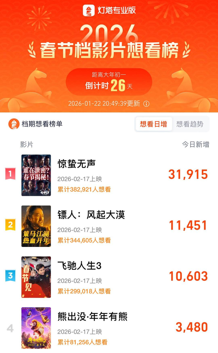 22日上午,张艺谋执导的《惊蛰无声》正式官宣将于2026年大年初一(2月17日)上映。加上此前定档的《飞驰人生3》《镖人:风起大漠》和《熊出没:年年有熊》,目前2026春节档就有了4部影片。