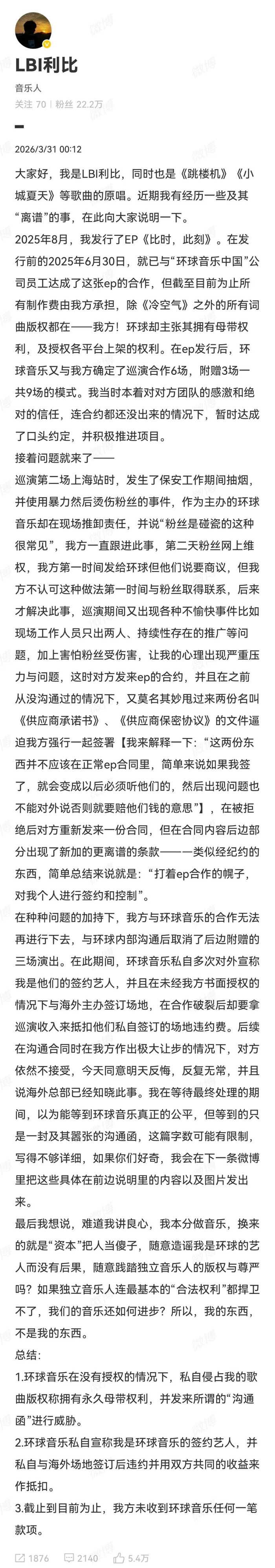 3月31日凌晨,音乐人利比发布长文,分享近期与“环球音乐中国”的纠纷。他自行总结了三点内容,具体如下: