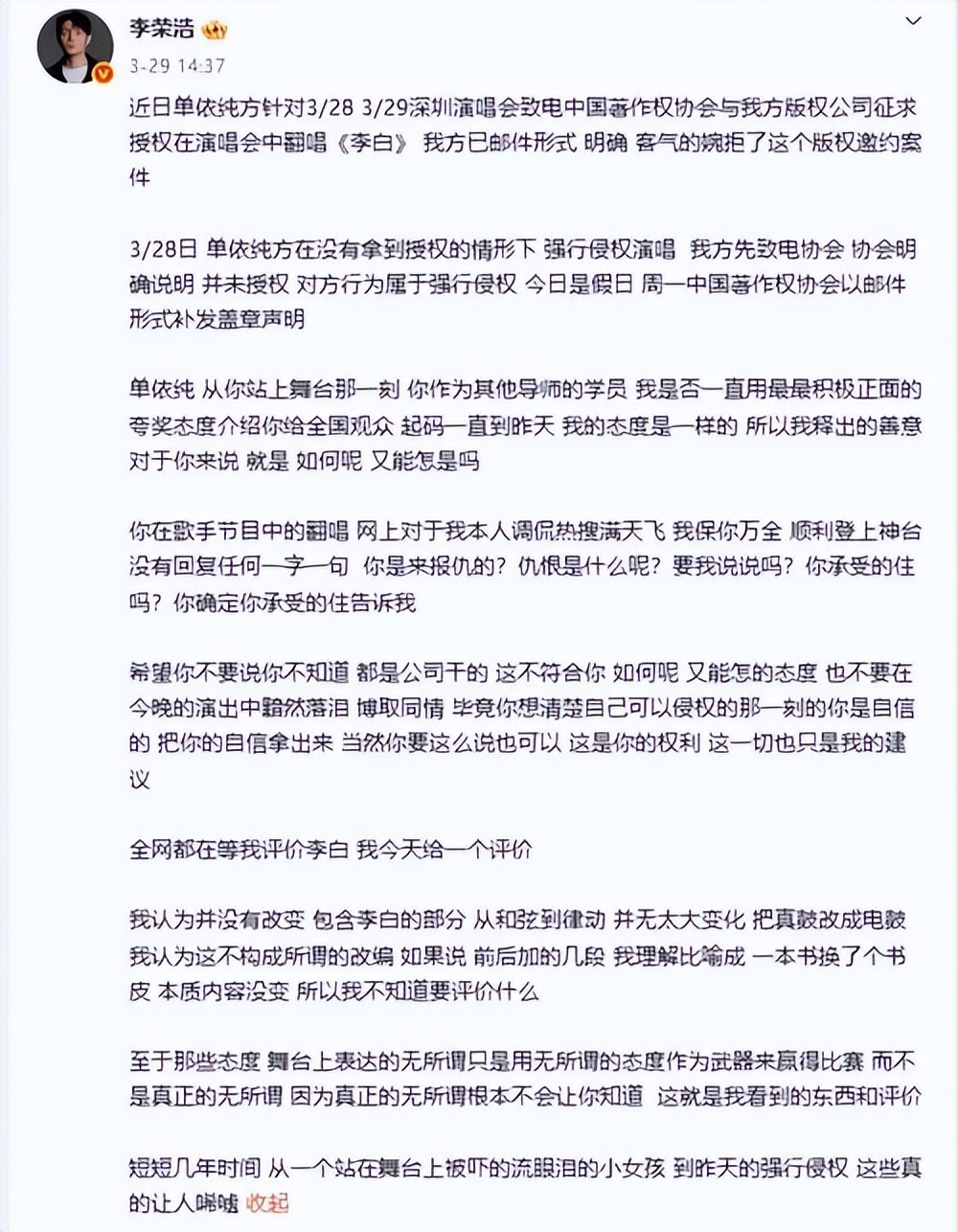 3月29日,歌手李荣浩在社交媒体喊话单依纯,文章中更多的不是指责,更像是一个长辈对晚辈的失望。