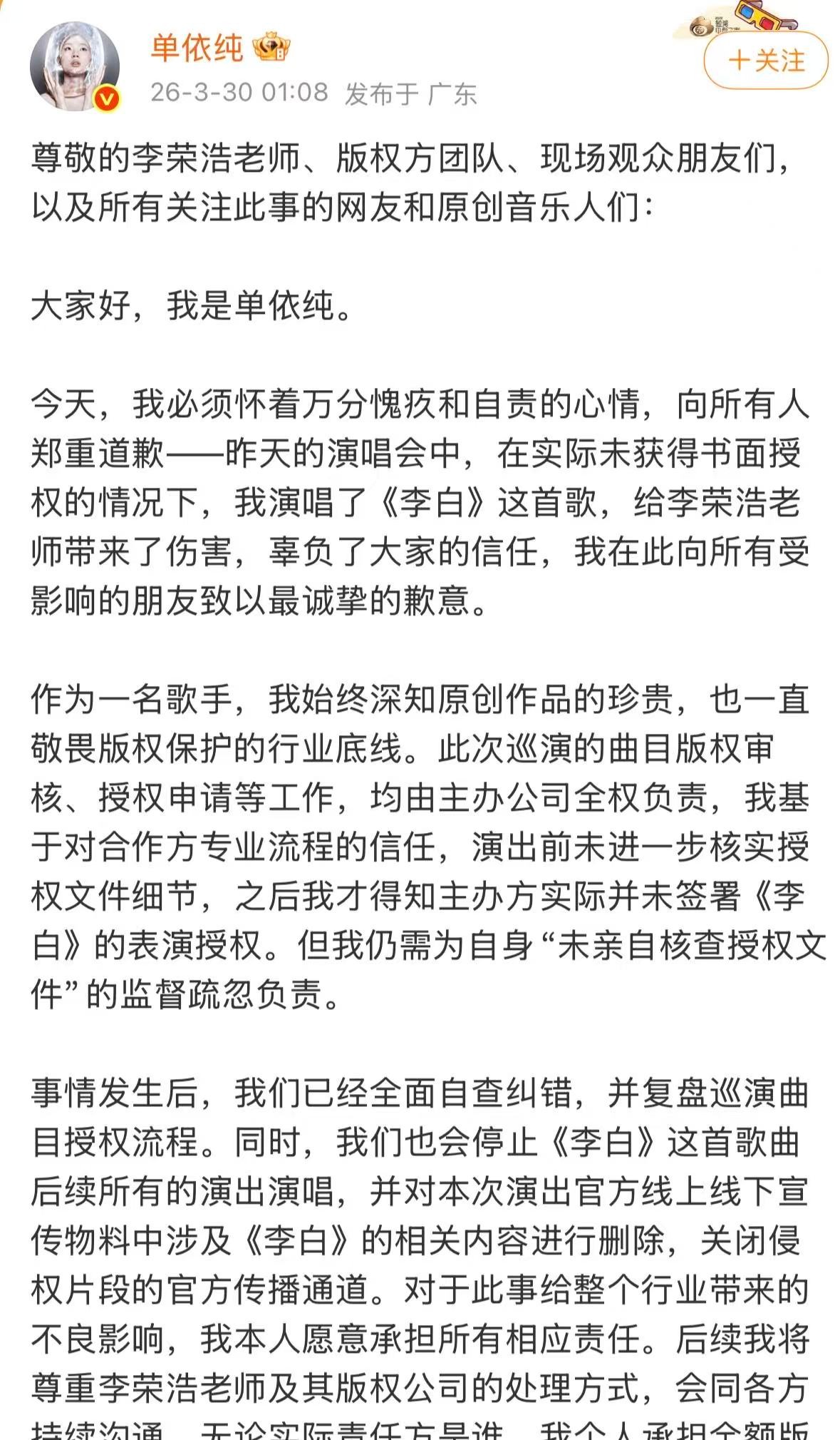 有网友表示,此前为了演唱邓丽君的歌,她历经波折拿到版权,她不会不知道版权的重要性,一句“由主办公司全权负责“,就把主要责任转移给了公司。