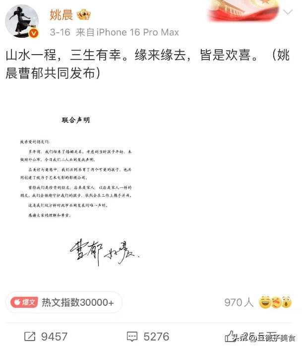 2026年3月,姚晨在社交媒体上,发布了一则联合声明,表示她和丈夫曹郁目前已经解除婚姻关系,之前没有选择则公布,是因为考虑到孩子的问题。