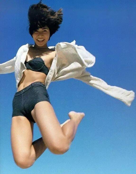 内田有纪穿着深蓝色比基尼内衣,披着白色衣裳,她俏脸清丽,弹跳时候双腿后撩,露出纤细的小蛮腰和修长的大美腿,魅力不可小觑!