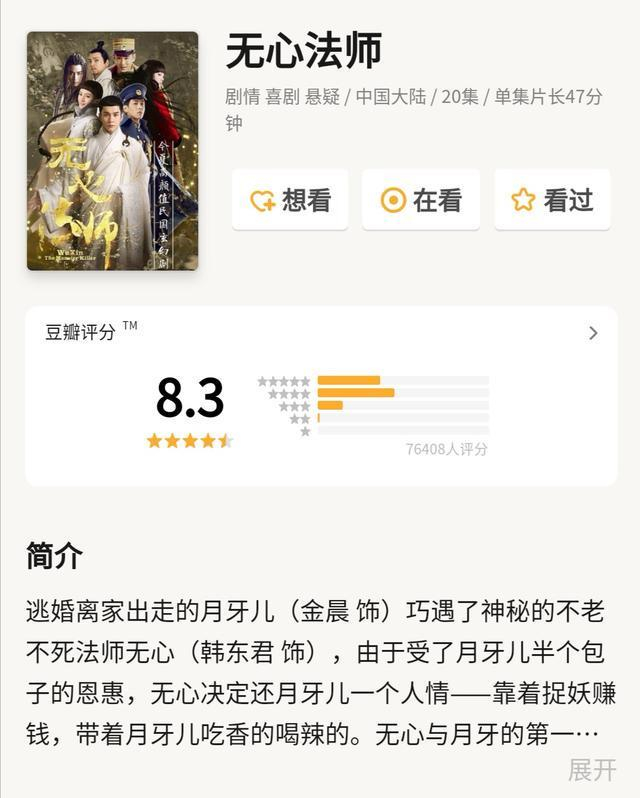 《无心法师》改编自尼罗的同名小说,讲述的是民国时期不老不死的法师无心(韩东君饰)偶然遇到了逃婚的月牙(金晨饰),结果误放妖人岳绮罗(陈瑶饰),双方一路斗智斗勇的故事。这部小说改编的“三无”网剧,凭借高颜值、人设新奇、一举成名,博得高人气,豆瓣评分高达8.3分。里面的主演也深受观众喜欢。