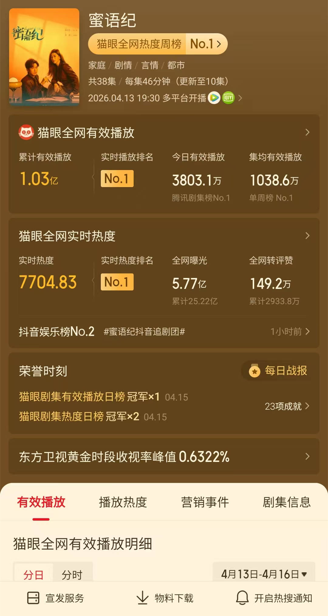 4月16日,电视剧《蜜语纪》在正版视频平台播出至第10集,在东方卫视已经连续四天上星播出。从酷云和CVB的收视率数据来看,该剧已经出现了收视率上的三连升。酷云方面的峰值收视率已经逼近0.7%,这和我预测的该剧收视率会向1%前进,已经较为吻合了。随着该剧更多剧情的上星播出,它在东方台的收视率破1%,只是时间问题了。