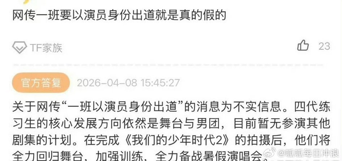 TF四代一班不会以演员身份出道,发展方向依旧是舞台和男团!王橹杰、张桂源、杨博文、陈奕恒、左奇函、陈浚铭、张函瑞、陈思罕,马上就要备战暑假演唱会了。
