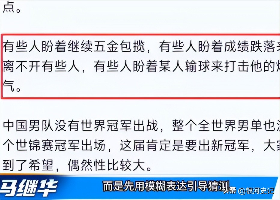 马继华之流或许正是打着“关注国乒”的旗号,实则干着挑拨离间、引战拉踩的勾当。