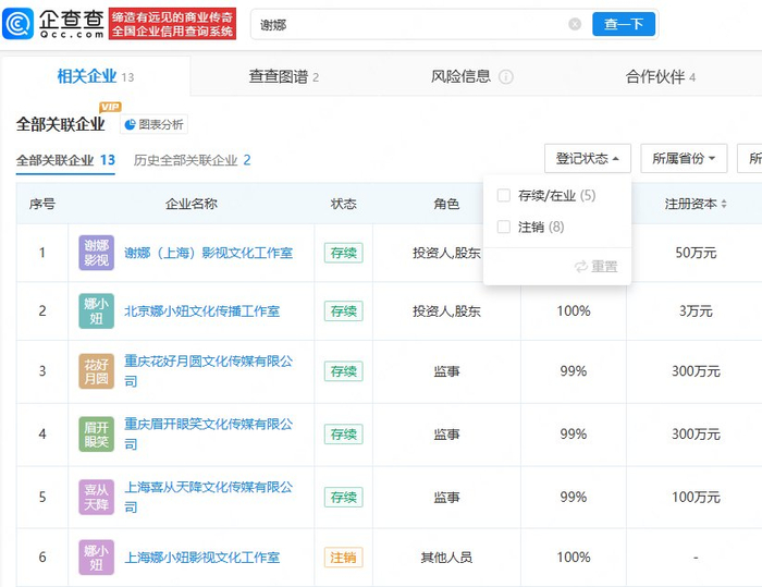 企查查APP显示,谢娜名下关联13家企业,其中5家为存续状态,包括重庆花好月圆文化传媒有限公司、重庆眉开眼笑文化传媒有限公司、上海喜从天降文化传媒有限公司等。此外,谢娜至今发行了三张个人专辑,包括《菠萝菠萝蜜》、《乐玩乐疯》和《蓝色巧克力》。第三方数据显示,谢娜近30日涨粉7.8万。(企查查)
