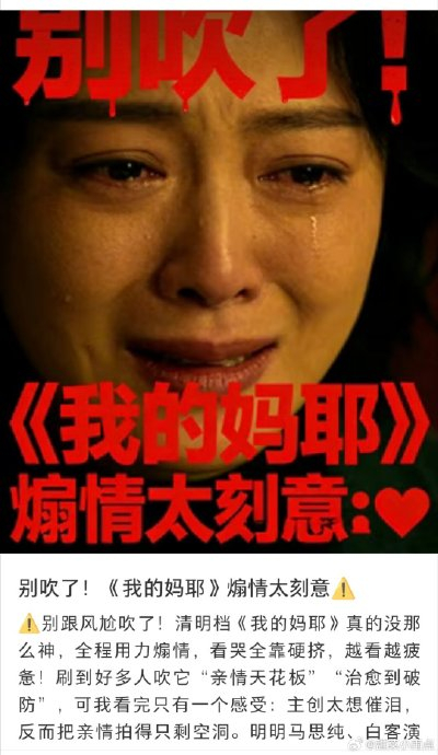 电影内容本身陷入"煽情刻意"的批评漩涡。虽有部分观众认可马思纯、白客演技,但"情绪堆砌"成为致命伤。密集哭戏、强效配乐和直白台词被指"硬挤眼泪"(如马思纯角色雨中崩溃桥段慢镜头滥用),对比《你好,李焕英》的细腻,该片被批"靠BGM催泪""失去亲情真实感"。这种争议使"亲情天花板"的宣传口号遭遇反噬。