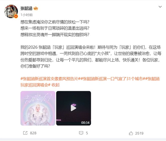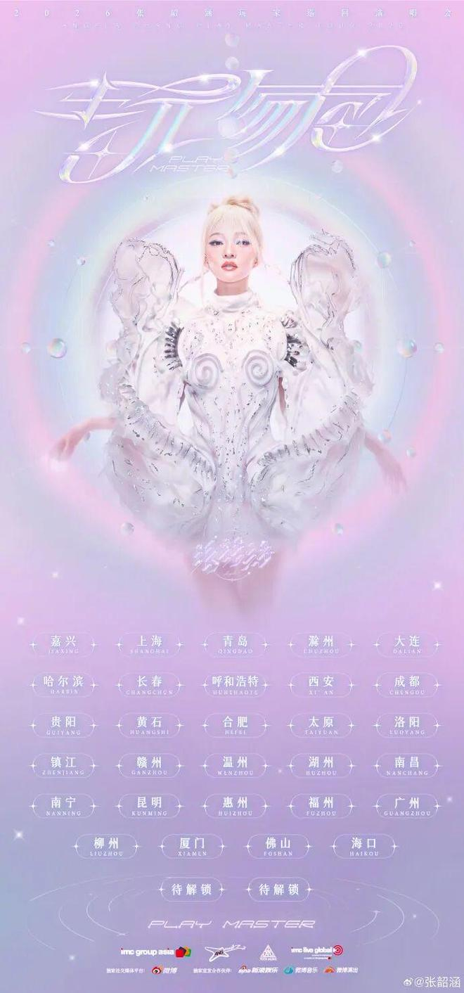 刚刚,张韶涵公布2026张韶涵「玩家」巡回演唱会,一口气官宣了31个城市。