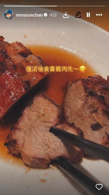 歌迷朋友们可以松一口气了,陈奕迅在5月19日晚上更新动态,发布一张叉烧的照片,同时留言报平安“复活后吃回块肉先”