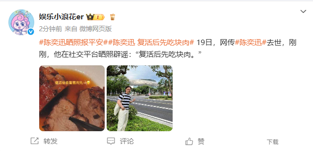 陈奕迅本人估计也是5G冲浪,还用“复活后”幽默反击自己被传死讯一事,有种死后翻身的既视感,陈奕迅四天前因为确诊新冠肺炎,被迫暂停在台湾高雄的演唱会,这个复活也代表着已经战胜新冠肺炎,身体完全康复。