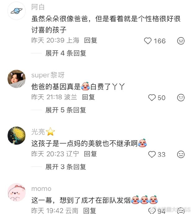 朵朵因酷似父亲陈思诚的长相引发讨论(被指“共用一张脸”),但其得体举止打破了公众对“星二代”的刻板印象。网友感慨:“外貌虽复制父亲,但谦和气质源于母亲的教育”。尤其对比陈思诚早年争议形象,朵朵的清爽举止被视作“养育战胜基因”的例证。