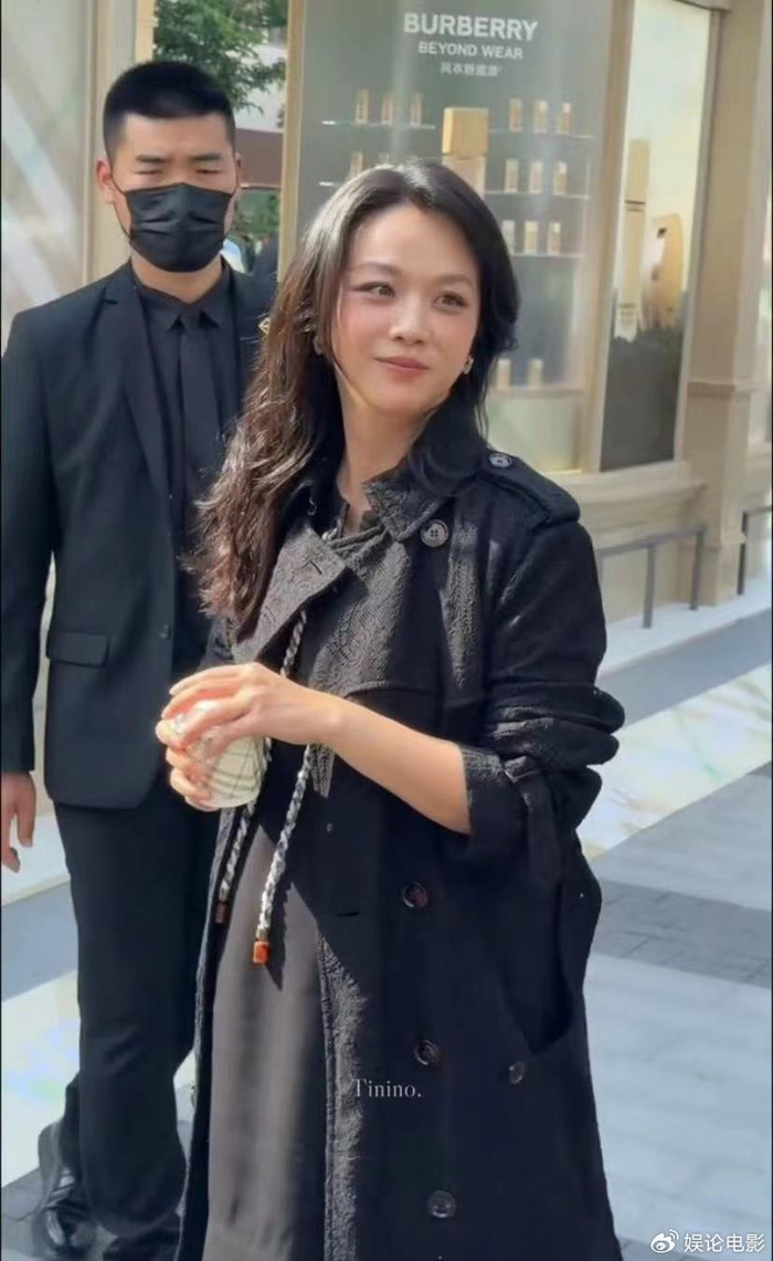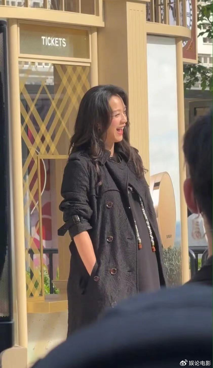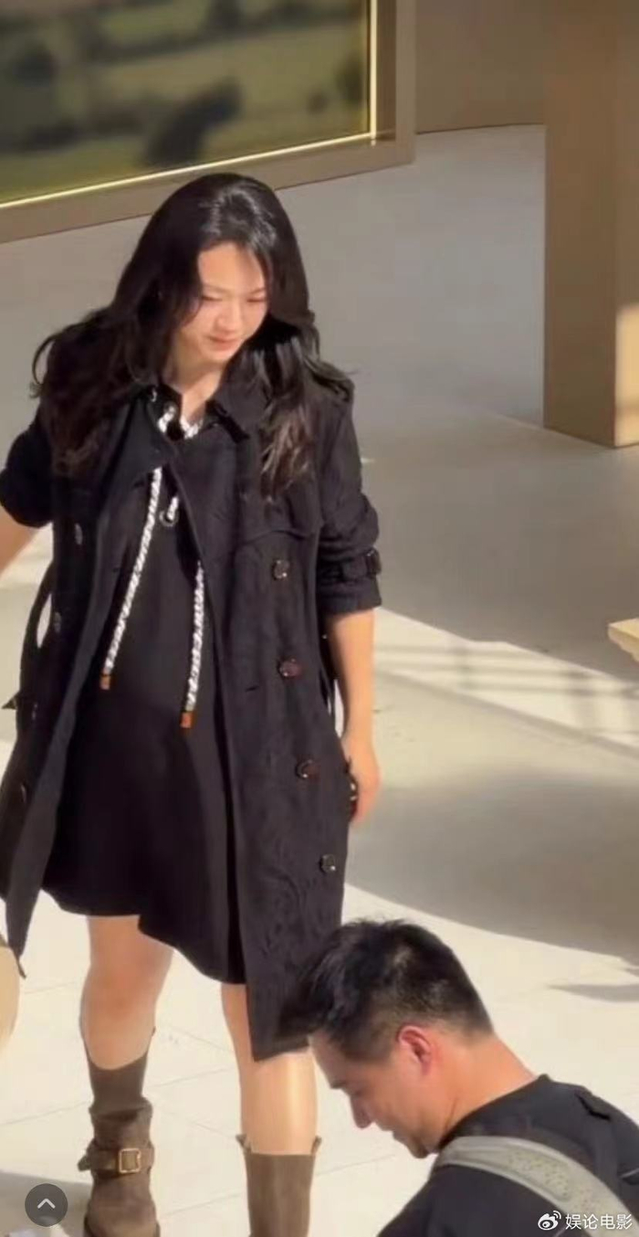 她身穿黑色长款宽松风衣,巧妙遮挡了身材曲线。