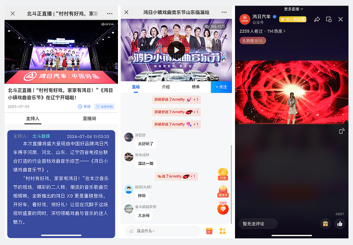 对于无法线下参加音乐节的粉丝朋友们,鸿日汽车通过官方抖音、视频号以及山东、辽宁两大省级电视台同步开启直播,为关注鸿日、喜欢戏曲、热爱唱歌的粉丝们营造出身临其境之感。据统计,山东·临淄、辽宁·海城两场活动的线上围观人数高达417.7万+,“云参与”活动的观众们在实时互动的过程中,还不忘对品牌的创新、精彩纷呈的节目、卓越的产品品质给出好评,点亮小红心。