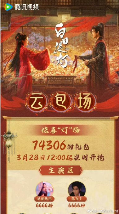 - 全域联动破圈:推动主演迪丽热巴机场手提宫灯造势、陈飞宇粉丝创作“四手联弹”名场面;联动刘宇宁献唱OST,发动韩娱、体育等多圈层名人参与“云包场”,仅后援会便送出15万份会员。