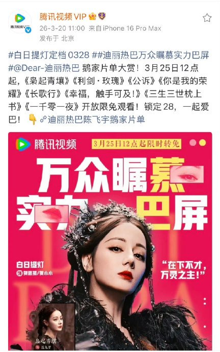 今日(2026年3月28日)中午12:00,由迪丽热巴、陈飞宇领衔主演的古装奇幻剧《白日提灯》在腾讯视频全网独播,会员首日可观看4集,SVIP抢先解锁第5集,次日起每日18:00更新2集。