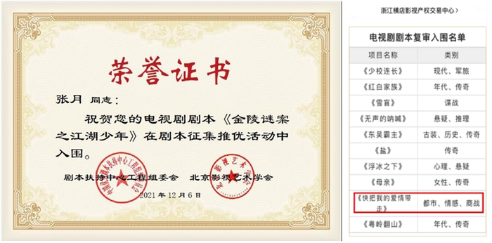 作为新锐编剧、导演,张月有多部作品获奖,其中,40集古装武侠剧《金陵谜案之江湖少年》,2021年12月获“国家剧本扶持中心工程组委会、北京影视艺术学会”荣誉证书;42集现代职场剧《金融时代》又名《请把我的爱情带走》,2021年4月获横店青年编剧作品第九名。张月目前完成了20集中医案件推理剧《悬壶问案》的剧本初稿。