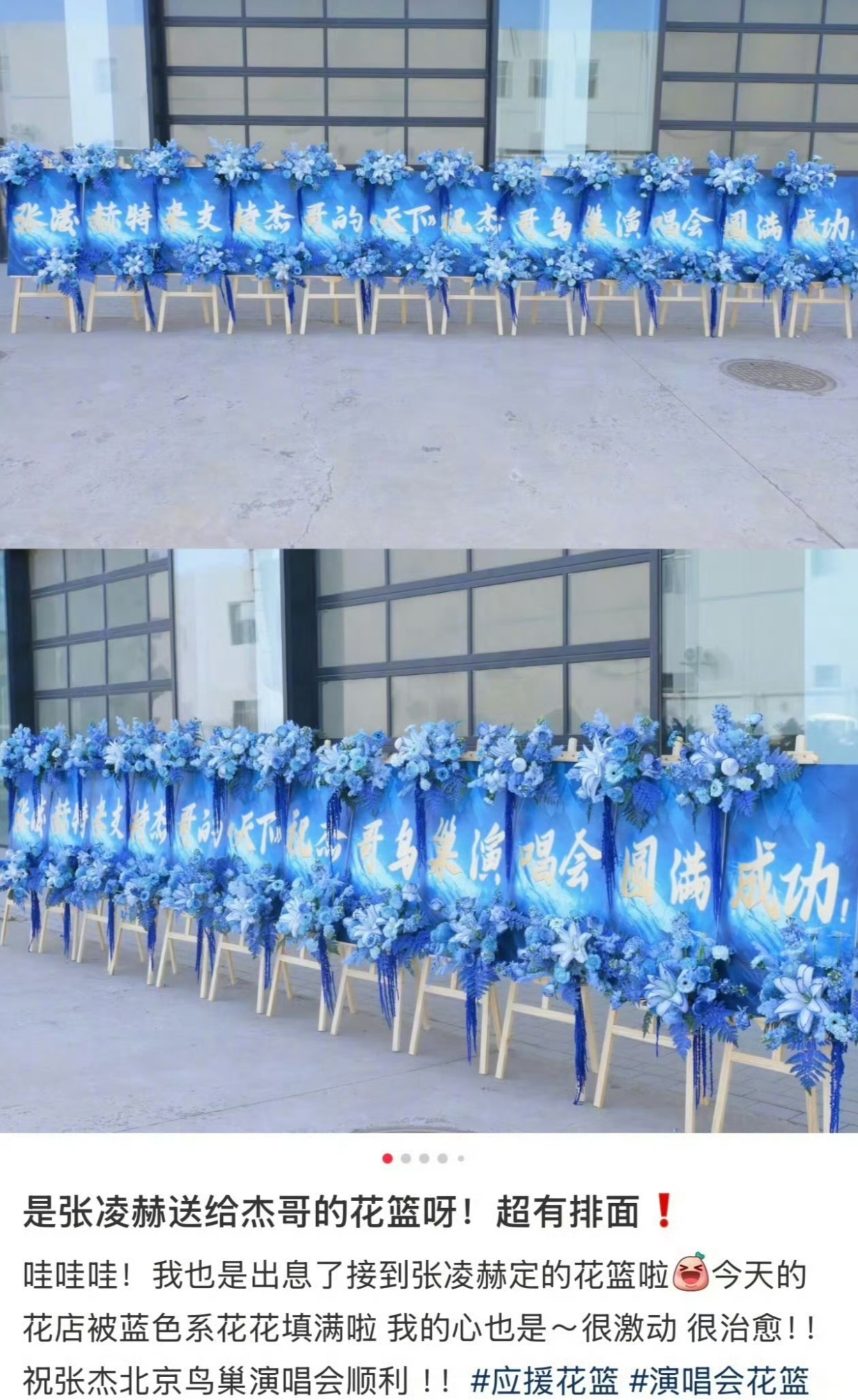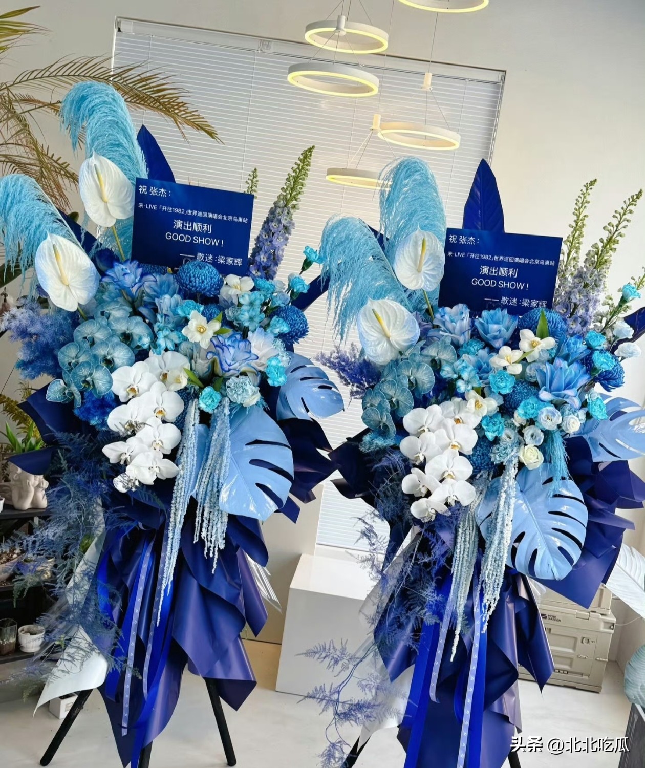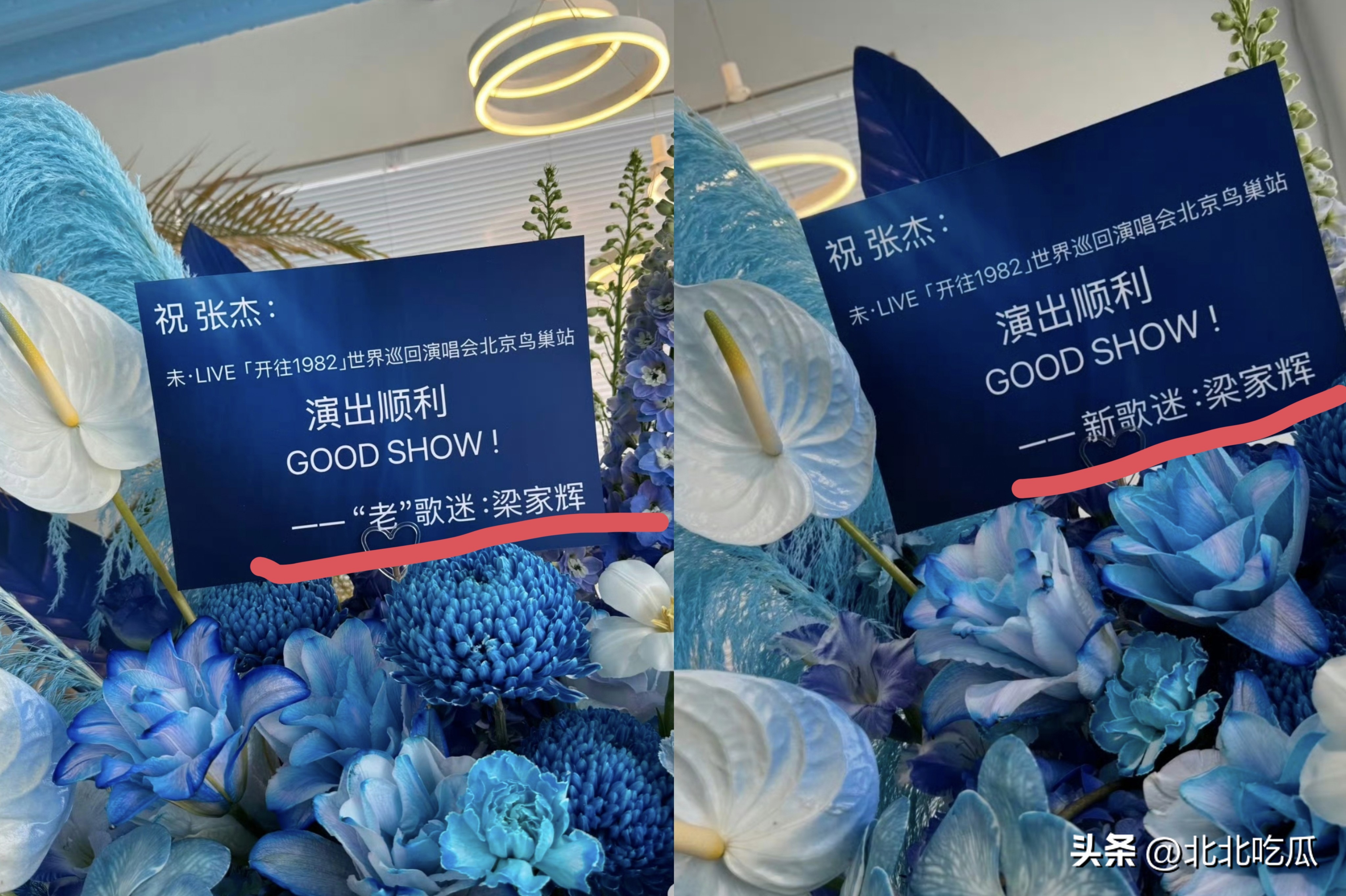 没想到,今天张杰的鸟巢演唱会现场,就被发现了来自前辈梁家辉送来的花篮。