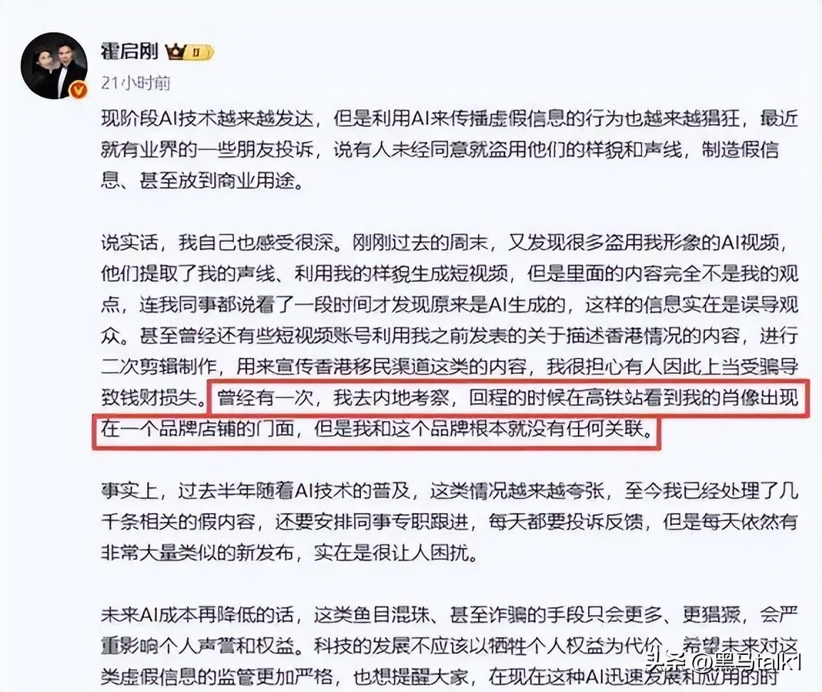 3月23日,霍启刚在社交平台发长文,讲述自己在内地高铁站发现被AI伪造视频用作广告的经历。他直言近期已处理数千条“假内容”,深感无奈。