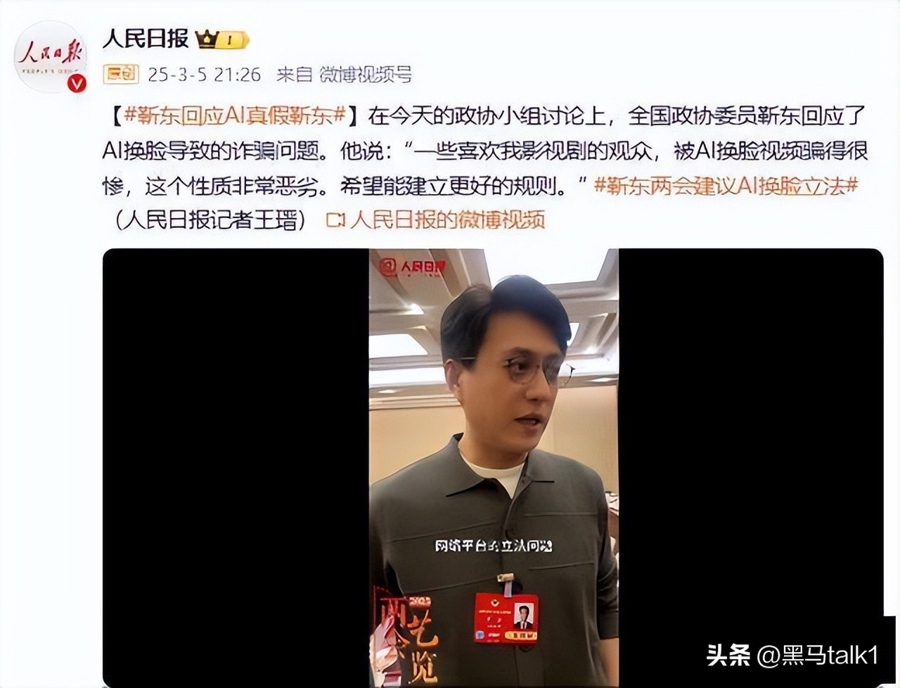 他提醒大家,连同事都一时分不清假视频,“普通人遇到,还不迷糊?”