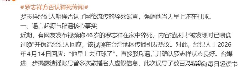 红星新闻(有消息称男星罗志祥在家中猝死 经纪人回应:他早上去打球了,罗志祥状态正常 2026.4.14)