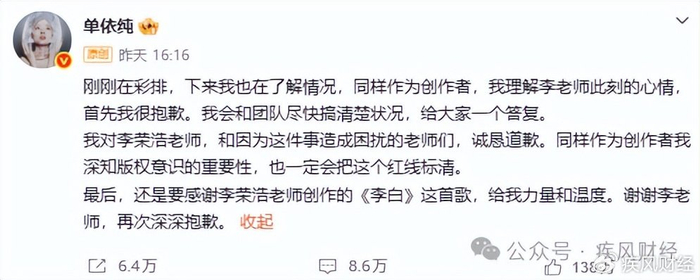 3月30日凌晨1点08分,单依纯发布长文,态度发生180度转弯。她承认此次翻唱的版权由主办方负责对接,本人未亲自核实授权情况,“实际并未获得书面授权”。她宣布:后续永久停止演唱《李白》,删除所有相关宣传物料,个人承担全额版权使用费及相应赔偿。