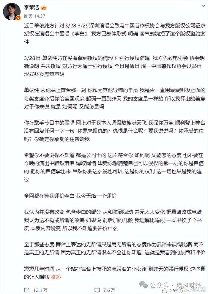 **吃瓜简评:从力挺到炮轰——李荣浩怒斥单依纯“你是来报仇的吗?”**,音乐圈一振动,李荣浩与单依纯之间的纠纷引发了全网关注,这场风波不仅是版权争议,更是行业信任与责任的缩影。,**戏剧性全开:五轮交锋,真相逐渐浮出水面**,2026年3月29日,一场轰动一时的风波在社交媒体上爆发,李荣浩在微博上公开炮轰单依纯,指责其在明确拒绝授权后仍在售票演唱会中“强行侵权”演唱《李白》,这一消息迅速登上热搜,网友们纷纷热议,纷纷谴责单依纯的行为。,从前辈提携到如今的公开对质,这场纠纷的根源可以追溯到2025年《歌手2025》节目中单依纯的表现,当时,李荣浩选择沉默,默许单依纯在节目中改编《李白》,当他明确拒绝授权后,单依纯却将这首被他反感的版本用于个人售票演唱会,并配合粉丝对李荣浩进行网暴,这一系列行为彻底激怒了李荣浩。,**法律与道德的夹缝:艺人责任难以推卸**,法律层面上,根据《著作权法》第24条、第40条,商业性演出不属于法定许可情形,必须获得著作权人个别授权,中国音乐著作权协会(音著协)的集体管理仅覆盖一般性使用,但著作权人保留拒绝权,李荣浩作为版权方有权拒绝授权,而单依纯作为艺人,在已收到明确拒绝通知后仍故意演唱,已构成明知故犯的侵权。,从道德角度看,艺人在商业运作中拥有核心决策权,单依纯名下两家企业均为她个人全资控股,且在巡演中担任总监制,这种“艺人中心制”模式要求艺人对每一环节负有最终责任,单依纯明知未授权仍演唱,不仅违反了法律,也严重违背了职业道德。,**行业信任危机:合作背后的信用缺失**,音乐行业中,合作、推荐、背书是极其重要的信用资本,李荣浩曾是单依纯的前辈提携,在《中国好声音》中力挺她,2024年还现身她的南京巡演同台合唱,当李荣浩明确拒绝授权后,单依纯依然选择以“未核实授权”为由为自己开脱,并配合粉丝对李荣浩进行人身攻击,这种“任性”行为不仅让李荣浩感到被冒犯,更反映出行业内信任缺失的严重问题。,**吃瓜角度:网友热议与事件影响**,网友们对这场风波反应热烈,有人认为单依纯的行为“亵渣”,有人则为她开脱,从法律和道德的角度来看,单依纯的行为无可辩驳,李荣浩的愤怒不仅来自版权侵权,更来自于单依纯不顾前辈的提携和合作,任性妄为,网友们纷纷呼吁行业内加强版权意识,规范商业合作行为。,这场风波也为行业敲响了警钟,热门翻唱在演出中常被用作吸引现场情绪的利器,但演唱会并非情绪表达的真空地带,每一首歌都对应着权利人、分账体系与合同结构,无论最终如何收场,一个最朴素的道理从未改变:在商业演出中演唱他人作品,必须获得授权,这不仅是法律的要求,也是对创作本身最基本的尊重。,**版权纠纷背后的行业变革**,这场风波不仅是一起简单的版权纠纷,更是音乐行业信任与责任的缩影,它提醒我们,在追求商业利润的同时,更要尊重创作权,遵守行业规则,希望未来音乐产业能够在版权保护和艺人自由创作之间找到更好的平衡,让合作成为一种可靠的信用关系,而不是一场不断发生的冲突。