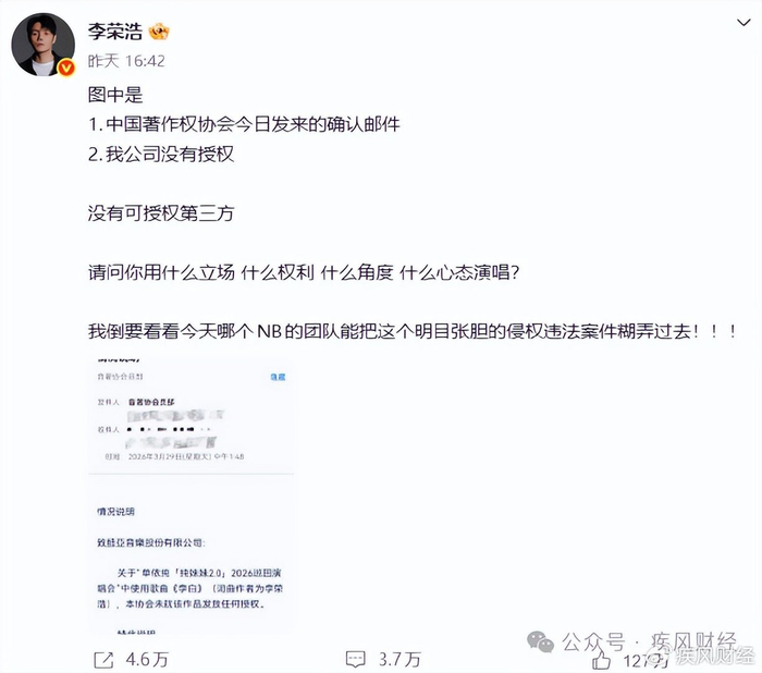 看到单依纯敷衍的回应后,李荣浩几乎在同一时间段再次发文。他直接晒出音著协的确认邮件作为铁证,连发四问:“请问你用什么立场?什么权利?什么角度?什么心态演唱?”并放话:“我倒要看看今天哪个NB的团队能把这个明目张胆的侵权违法案件糊弄过去!!!”