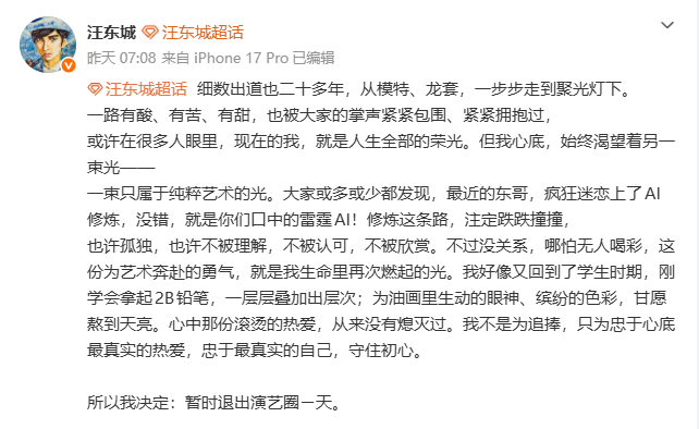 4月1日,汪东城在社交平台发布长文,细数出道20余年心路历程:“从模特、龙套,一步步走到聚光灯下……我心底,始终渴望着另一束光——一束只属于纯粹艺术的光。”文中多次提及他近期“疯狂迷恋”的AI艺术项目“雷霆AI”,并宣布“暂时退出演艺圈——一天”。