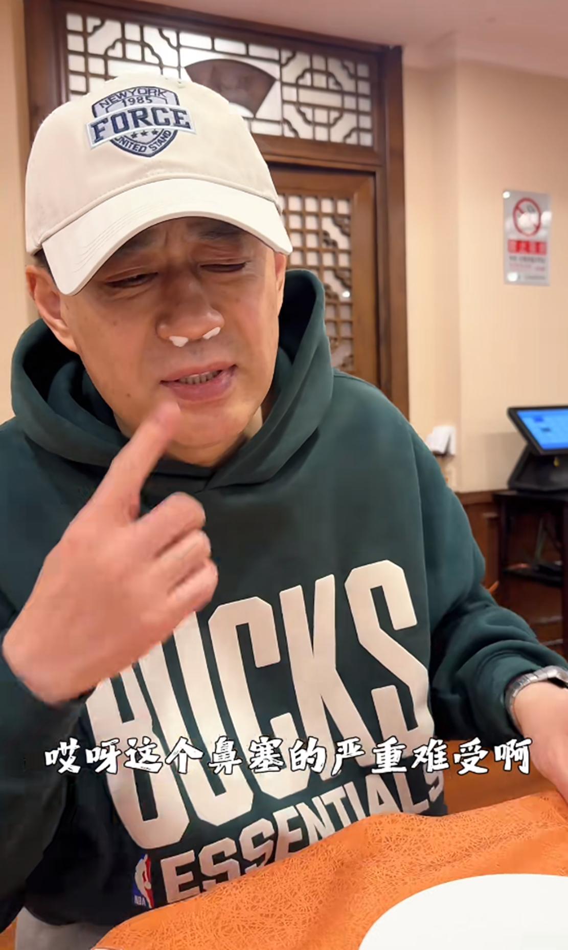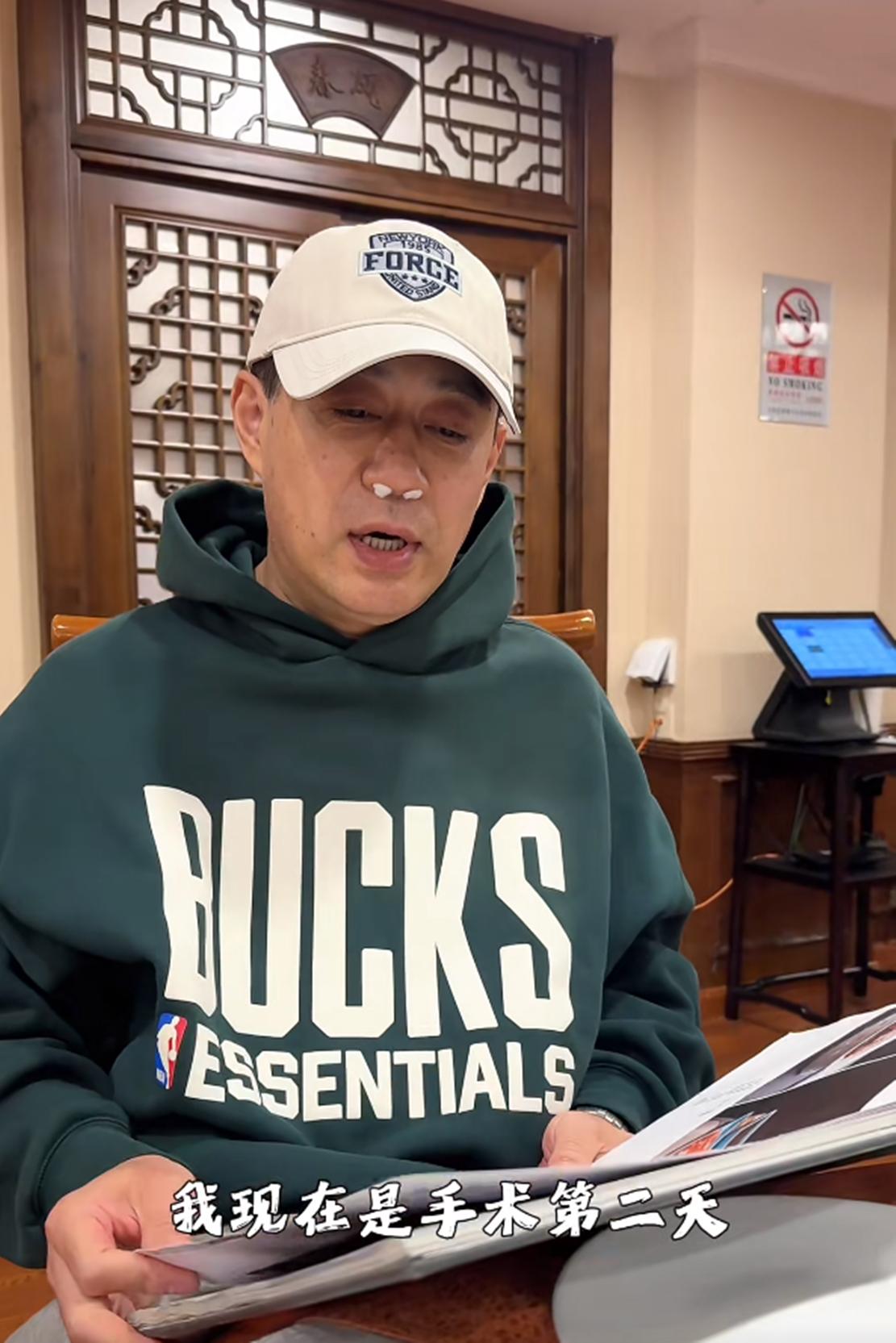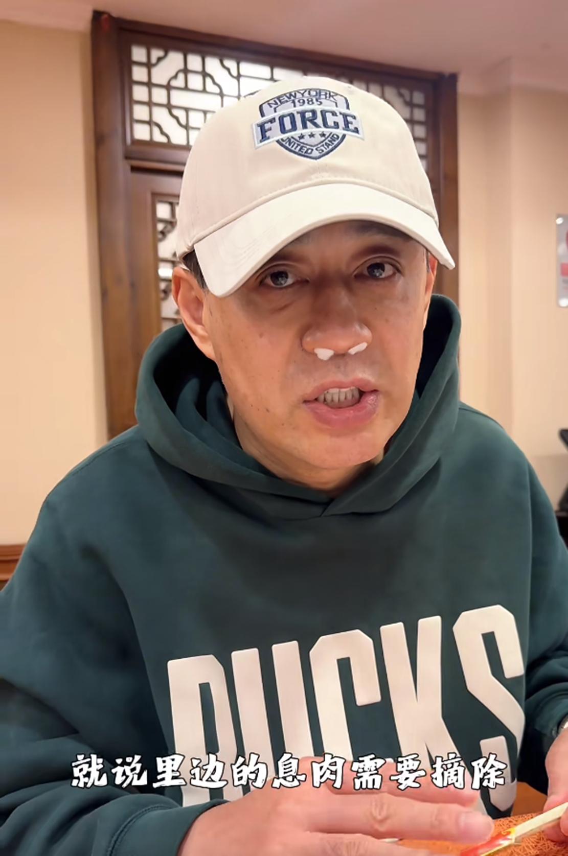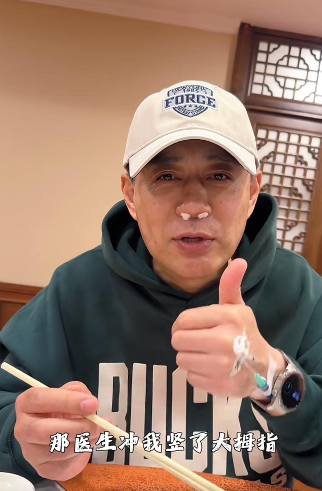 术后第二天的刘钧,他的鼻孔处塞着两小块白色医用棉球,右手手背还插着留置针,虽说还处于术后恢复期,但刘钧整体精神状态却显得十分乐观、从容。他一边用餐,一边和大家分享手术经历,说话时的他眼神明亮、嘴角上扬,传递出一种积极面对身体不适的豁达态度,也展现了他作为公众人物的亲和力以及性格中坚韧、开朗的一面。