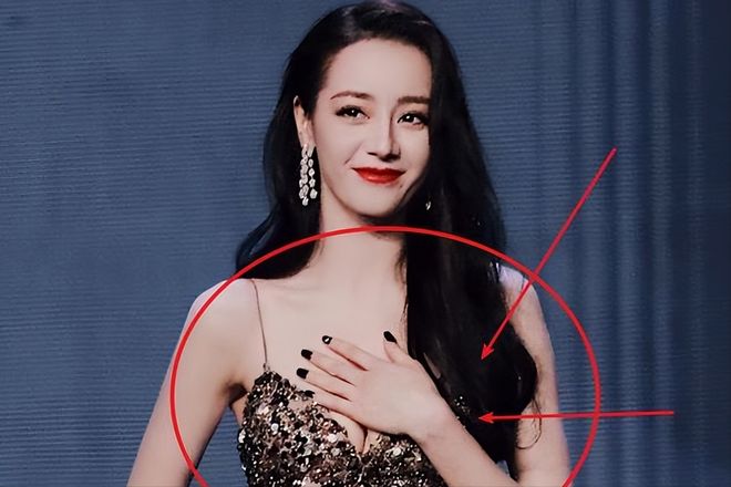 最典型的就是迪丽热巴,每次穿深V走红毯,双手几乎就没离开过胸口,要么交叠捂着,要么单掌轻掩。