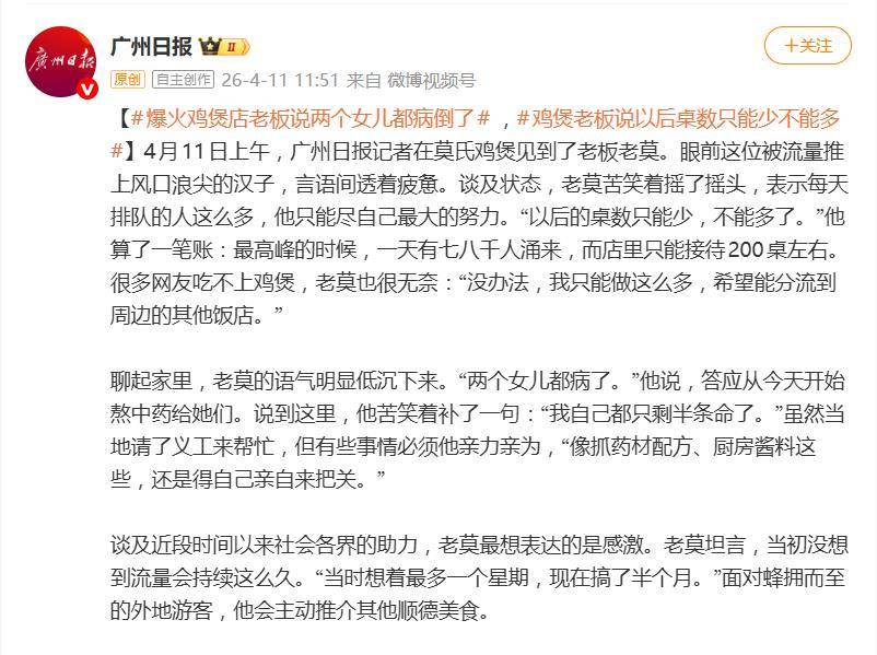 **吃瓜简评:莫氏鸡煲老板的“红”与“底料”**,最近佛山顺德的鸡煲界又火了一波,莫氏鸡煲的老板莫叔可谓是“红”到爆,连谱都快要炒翻了!谁能想到这位62岁的“鸡煲大师”却在“红”到临近崩溃的时候,选择了一条“最不想红”的路——直接公开鸡煲的秘方,还决定五一期间闭店三天,去好好睡觉陪陪家人。,---,这波操作,堪称“最不想红的老板”!莫叔的鸡煲原本已经是地道的广东风味,特别是药膳汤底的设计,契合了广东人滋补养生的需求,清明假期单日接待200桌,排队时间甚至有3到4小时,甚至有人凌晨蹲守、跨省驱车200公里来打卡,日均翻台200多桌的疯狂客流,莫叔一家人全员上阵,每天工作近20小时,身体完全透支,女儿因熬夜高强度工作累病,需要安排中药调理;员工连吃十几天的外卖,连饭都没时间准备;莫叔自己更是苦笑道:“一天一起床就干干干,不信你做一天试试,给你赚100万也没用,根本不在意这些东西。”甚至在生日时,他还许愿“早点倒闭”。,---,莫叔并不是一个轻易放弃的人,面对被流量“逼”到的崩溃边缘,他选择了一种“釜底抽薪”的方式——4月10日,他直接公开了鸡煲的核心配方:五指毛桃、土茯苓、茯苓、陈皮、姜、黄豆、红枣,7种药材,完全透露了季节调整的方式和做法,他的坦白不仅仅是为了让其他人能轻松复制(他说“不怕别人仿制,就怕游客越来越多”),更像是一种对自己和对这个时代的无奈宣泄。,---,这波操作,瞬间被网友们调侃为“最不想红的老板”,更绝的是,他还决定在五一期间放假三天,鸡煲没得吃!这让人既心疼又无奈,毕竟这位老板的“红”,本质上就是他的身体在“红”到极限,正如一位网友评论:“当所有人都挤破头想‘红’的时候,这位老板却用最朴实的话道出了真相:‘红有什么用?身体垮了赚再多也没意义。’”,---,这场由一张配方引发的“假期起义”,不仅仅是一位老板的疲惫反抗,更像是对所有被流量裹挟的人的一记清醒提醒,我们常说“红红火火”是成功的标志,但莫叔用自己的方式告诉我们:真正的成功,应该以身体健康和家庭幸福为底线。,---,在这个追求“流量先行”的时代,莫叔用他的选择点出了一个深刻的命题:无论是鸡煲的配方,还是一个人的身体,都无法被流量无限复制,而真正的“底料”,就是那份对生活的理解和对自我的坚持,或许,这才是莫氏鸡煲最独特的“风味”吧!## 鸡煲里的抗争者:一个关于“红”的寓言,在这个流量疯狂的时代,莫氏鸡煲的老板莫叔用一锅鸡煲的秘方,写下了一个让人窒息的故事。,清明假期,佛山顺德的街道上,排起了三四小时的长队,游客们不惜跨省驱车200公里,只为一碗那叫好"地道风味"的鸡煲,镜头下,是一个62岁的老人,像一台精准的机器,在近20小时的工作中运转,他的女儿因熬夜高强度工作而病倒,需要中药调理;员工们只能靠外卖维持生计;而莫叔自己,则在镜头前苦笑着说:"一天一起床就干干干,给你赚100万也没用。",在这场"鸡煲狂欢"中,游客们疯狂地追逐着"地道风味"的体验,而创造这份风味的老板,却在生意最好的时候,选择了一次"任性"的休息,这位被称为"最不想红的老板",用一次闭店的行为,向这个时代发出了一段隐喻深刻的声明。,在商业社会的狂欢年代,"红"已经成为了一种集体性的精神寄托,人们在追逐着"地道风味"的同时,也在无形中成为各大平台流量的俘虏,当你站在排队的人群中,感受着阳光晒得你发烫,听着此起彼伏的"老板,快点做鸡煲"的呼唤,你是否想过,这些"地道风味"背后,是不是另一个更为严峻的现实?,莫叔的选择,恰如其分地戳中了这个时代的集体焦虑,在这个流量至上的世界里,人们都在用自己的一切去追逐所谓的"红",却往往忽视了最重要的"底料"——身体,就像莫叔说的:"红有什么用?身体垮了赚再多也没意义。",这不仅仅是一个老板的"任性"行为,更像是一次集体觉醒,它提醒着我们,在追逐所谓"地道风味"的过程中,我们是否也该停下脚步,照顾一下自己的身体?在这个被流量裹挟的时代,或许我们更需要学会放慢脚步,享受生活的本味,而不是永远处在"红"的饕餮般饥渴。