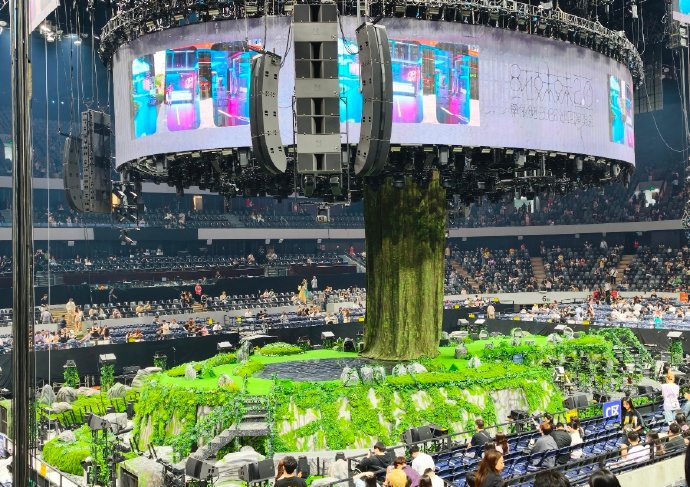 采用四面台无死角设计,结合超1500片LED屏与环绕投影,构建动态“声光群岛”。当演唱《珠玉》时,舞台瞬间切换为水波潋滟的江南园林,戏曲水袖舞者的全息影像与单依纯的歌声交织;而演绎电子曲风《有趣》时,几何光束如脉冲般穿透空间,形成科技感十足的声波矩阵。L-ISA超真实声场技术精准覆盖每个角落,即使山顶观众也能清晰捕捉她标志性的气声转音,实现“闭眼如在耳畔吟唱”的极致体验。