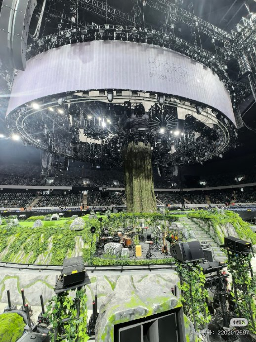 舞台以“破壳新生”为核心意象,将整座场馆转化为一座悬浮的“生态绿岛”。地面铺设真实草坪与错落树木,配合动态投影技术,使苔藓、藤蔓等自然元素随音乐节奏生长蔓延,暗合单依纯“用音乐滋养心灵”的治愈主题。开场曲《七彩光》中,单依纯身披Robert Wun定制亮钻头纱,从中央悬浮的透明蛋形装置缓缓降落,宛如自然孕育的“声之精灵”,呼应专辑《纯妹妹》的生命哲思。