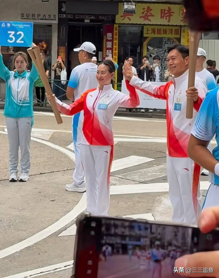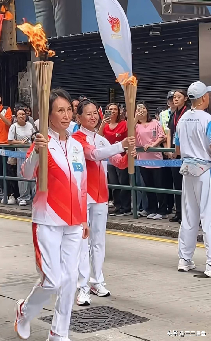 接着,她与上一位火炬手击掌合影,全程身姿挺拔,精气神十足。尽管年过六十,气质依旧出众,素颜也掩盖不住她大方干净的气场。