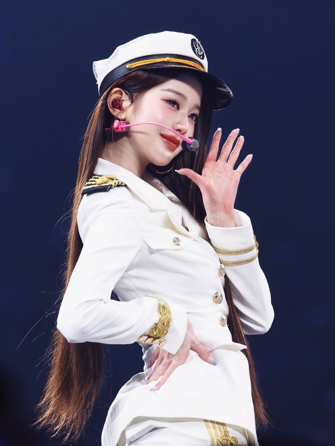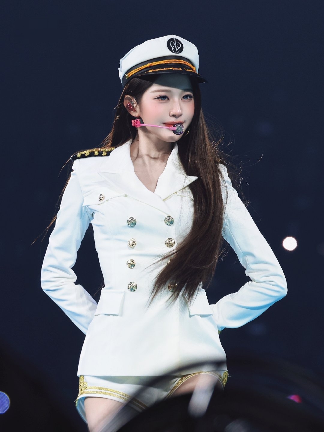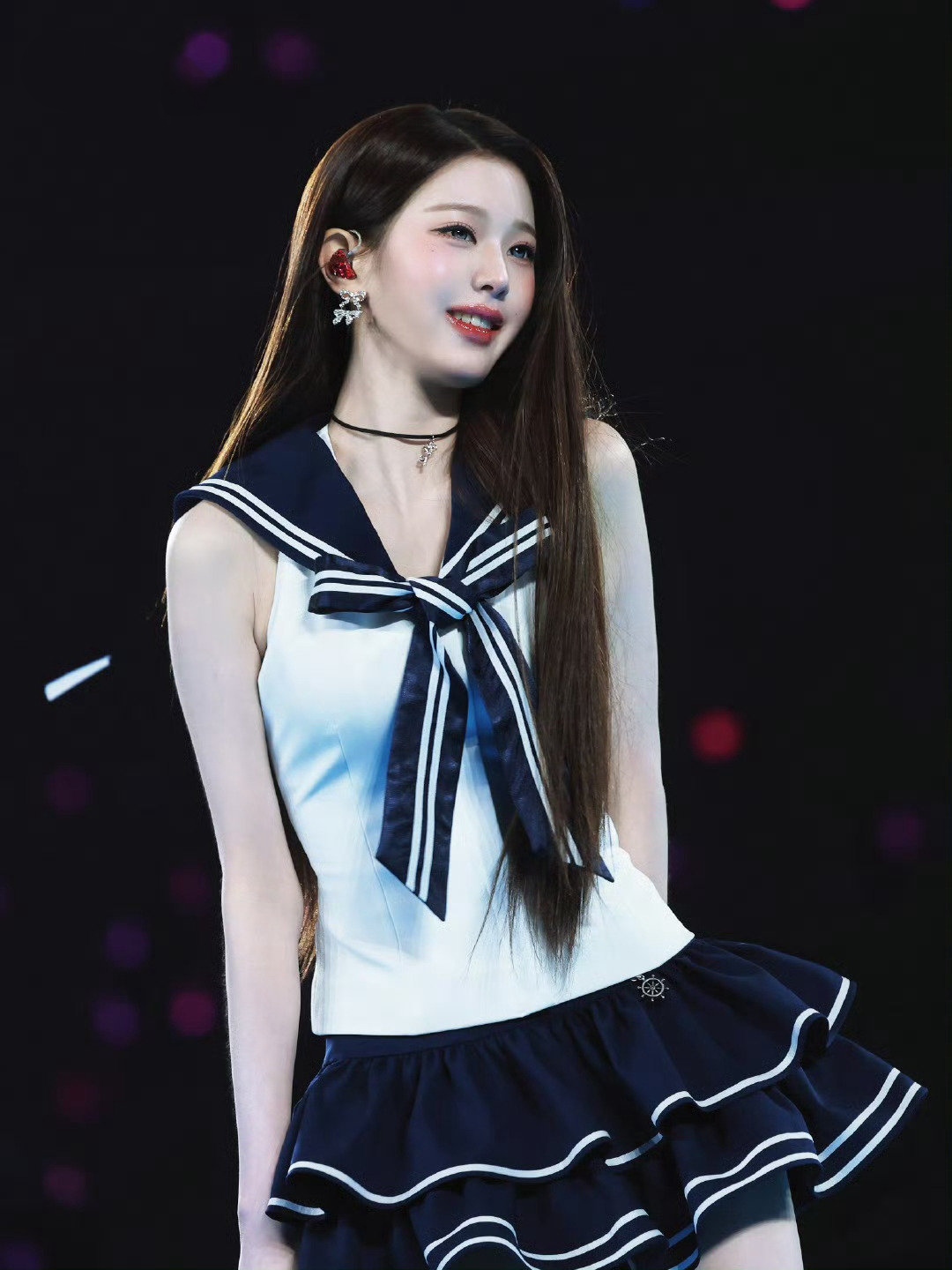 在3月21日的粉丝见面会舞台上,张元英以经典蓝白水手服+海军帽造型亮相,简约配色搭配肩章、金色穗带等精致细节,高腰线短裙设计完美凸显她173cm的优越身材比例,头身比与长腿线条被放大到极致,轻松拿捏复古学院风与元气少女感。搭配高马尾或蓬松长发造型,敬礼、比心等舞台动作灵动俏皮,表情管理全程在线,唱跳状态稳定在线,每一帧都宛如动漫破壁。