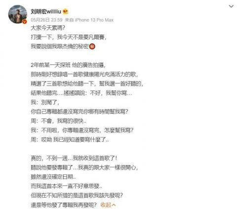 5月26日,刘畊宏直播运动后发文透露与周杰伦之间的秘密,他爆料称周杰伦在听过自己的歌后主动要求帮他写歌,并用一周时间就完成。