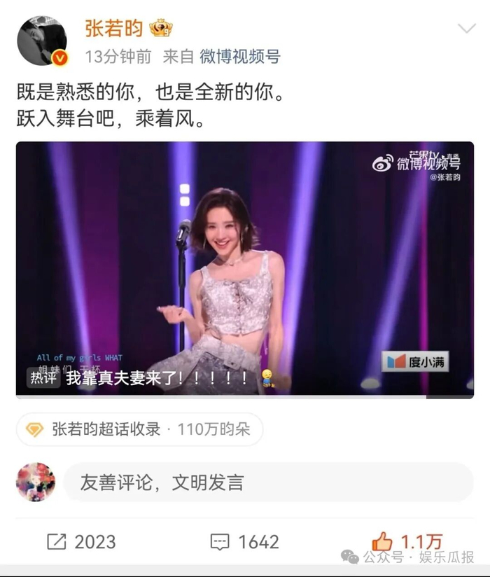 事件的起因,是唐艺昕登上《乘风2026》的舞台,迎来自己的唱跳首秀。一直以甜美形象出圈的她,此次大胆突破舒适圈,演绎蔡依林的高难度唱跳曲目《I’m Not Yours》,酷飒十足的舞台表现,让观众看到了她截然不同的一面。而在舞台播出当晚,张若昀悄悄在个人微博,发布了一段亲手拍摄的唐艺昕舞台直拍视频。