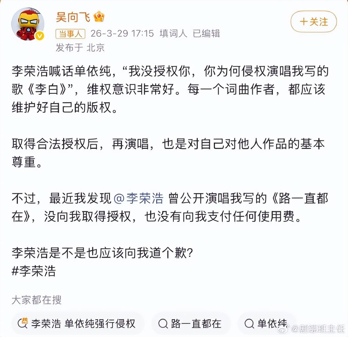 吴向飞的喊话,颇有“以彼之矛,攻彼之盾”的意味。他借用了此前李荣浩为合作歌手单依纯维权的逻辑,指出李荣浩本人曾在公开场合演唱《路一直都在》,却从未向身为词作者的自己申请授权或支付报酬,并直接质问:“是不是也该道歉?”这一招,直接将李荣浩架上了“双重标准”的拷问台。