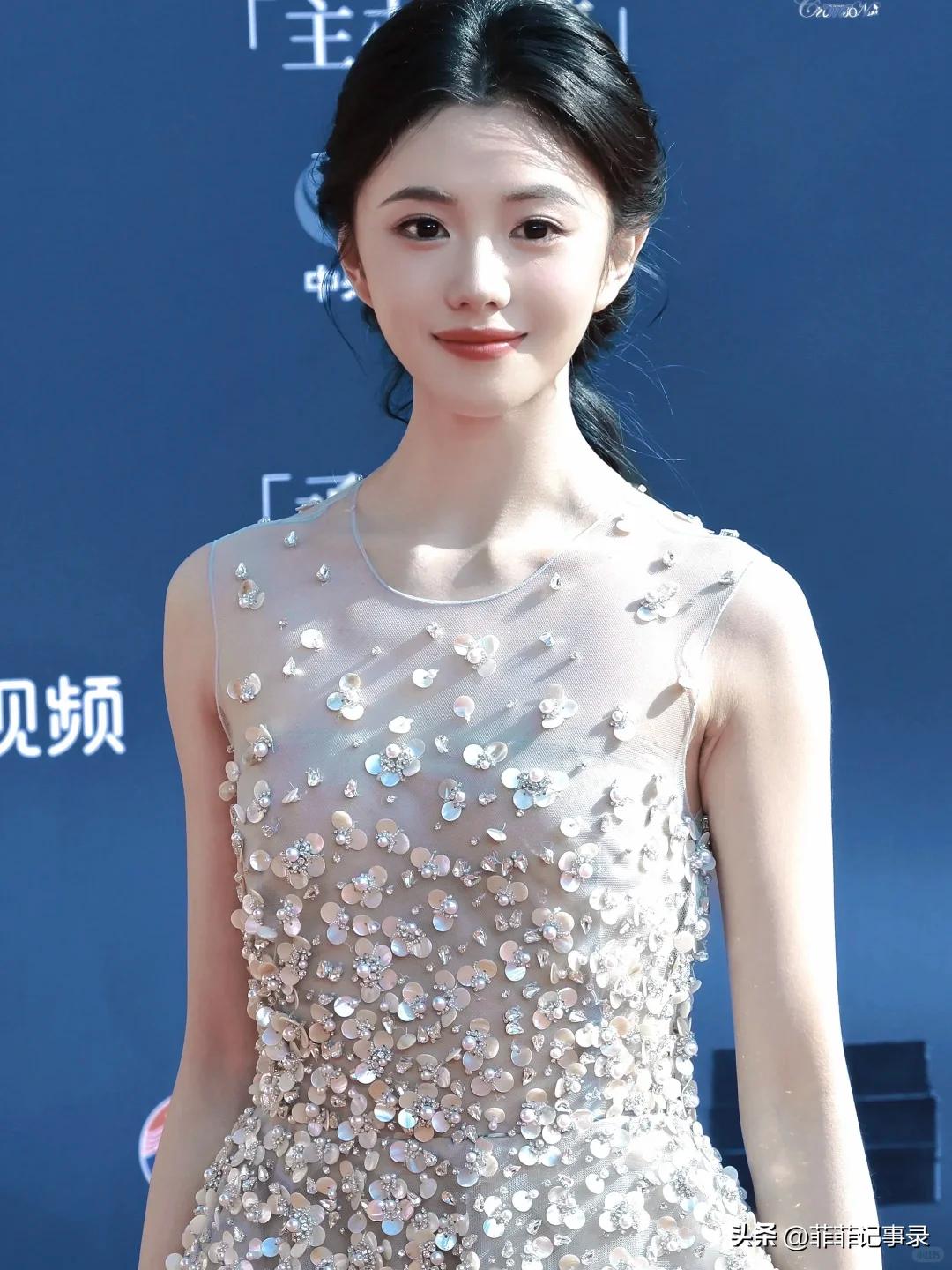 刘浩存一袭渐变蓝碎花亮片纱裙,温柔如春日暖阳。