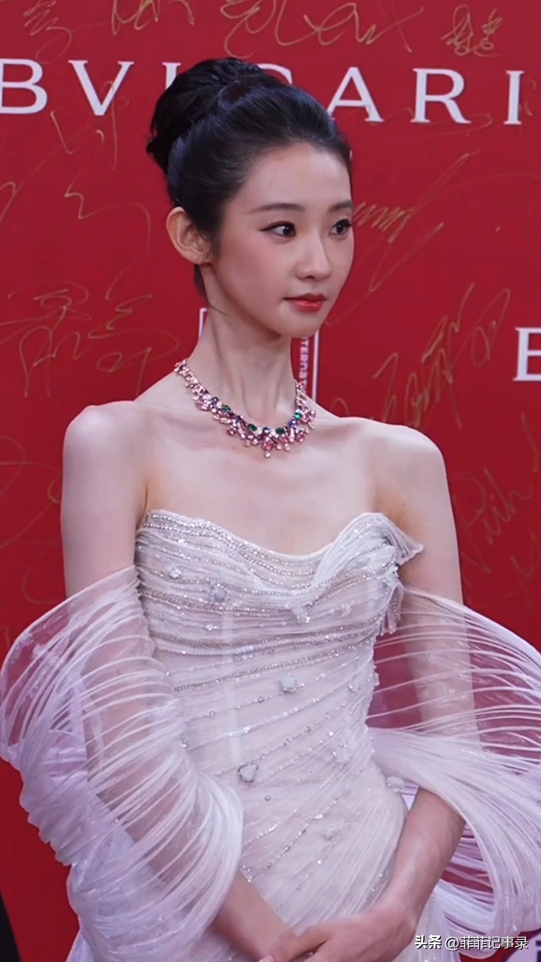 头发利落盘起,露出饱满的额头和精致的五官,整个人看起来雍容大气,端庄从容。