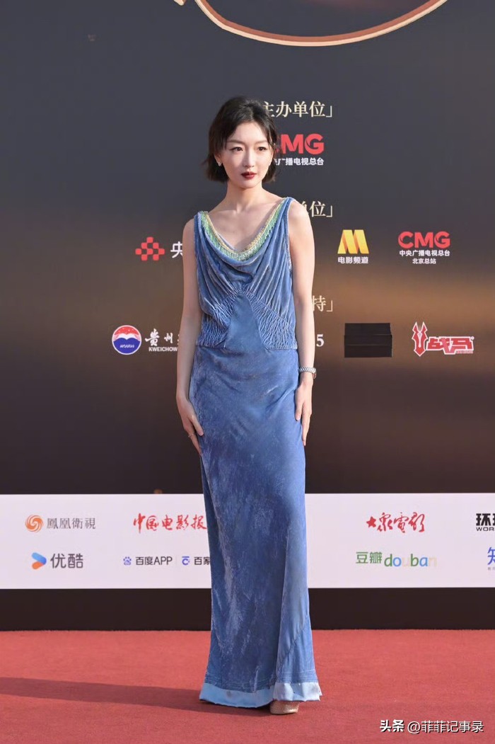 这次电影盛典上,她穿蓝色丝绒长裙,不刻意玩性感,身材看起来还算正常。