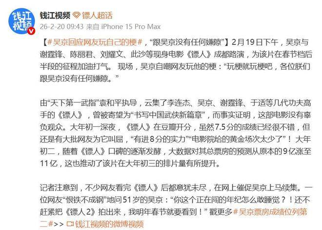 **吴京大方回应被网友玩梗:各位朕们与吴京没有任何嫌隙——《镖人》这场“江湖路演”让观众爱不释手**,电影《镖人》的路演成了这部春节档武侠大片的一场“心灵之旅”,在成都的路演现场,吴京一如既往的大方,不仅展示了他对这部电影的热情,也用一句幽默的回应点燃了全场气氛。,当观众提到网络上流行的调侃梗“朕与吴京何时有过嫌隙”时,吴京没有任何躲避的迹象,反而以他标志性的爽朗笑声接住了这个梗,他轻松地说:“玩梗就玩梗吧,各位朕们和吴京从来没有嫌隙。”这一句台词不仅点燃了现场的气氛,更让观众感受到吴京的幽默感和大气派,尤其是他将单数的“朕”转化为亲切的“朕们”,瞬间拉近了与观众的距离,赢得了全场的掌声。,这场路演的阵容堪称豪华,吴京与谢霆锋、陈丽君、刘耀文、此沙等主创齐聚一堂,共同为这部电影助力,吴京在现场毫不避讳地自嘲,不仅提到了网友们对他和其他演员的各种创作,还表现出了极强的轻松豁达态度,这种大气造型不仅为电影增添了不少亲和力,也让观众更喜欢这位硬汉。,作为由天下第一武指袁和平执导的《镖人》,这部电影集结了李连杰、吴京、谢霆锋、于适等多位动作明星,市场对其寄予厚望,从票房数据来看,电影果然不负众望,豆瓣上首映分7.5,虽然有些观众认为这个分数有些保守,但整体口碑持续发酵,票房表现强劲,短短几天就从9亿上涨到11亿,排片量也随之增加。,观众对这部电影的反响热烈,许多人认为《镖人》不仅是一部武侠大片,更是一场“江湖路演”。“风起大漠”、谢霆锋的打戏、刘耀文的反派角色,这些元素都让观众意犹未尽,有网友调侃道:“你这个正在闯的年纪怎么敢睡觉?!赶紧把《镖人2》拍出来,我明年春节就要看到!”这种带有调侃的催促,恰恰体现了观众对电影品质的高度认可。,从轻松应对梗,到用作品证明实力,吴京和《镖人》的剧组似乎在通过一场精妙的江湖路演,让电影自己镖中观众的心,那些关于“朕与吴京”的玩梗,逐渐演变成了观众与电影之间一种心照不宣的默契和狂欢,正如吴京在路演中说的:“玩梗就玩梗吧”,这场“江湖路演”也让大家在笑声中感受到电影的魅力和力量。